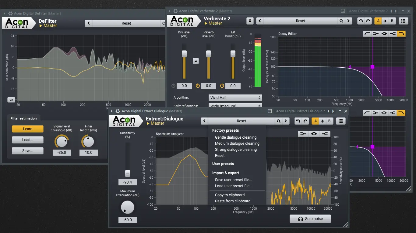 Использование Acon Digital Collection начинается с настройки рабочего пространства и подключения совместимого аудиоустройства через ASIO или стандартный Windows-аудиодрайвер. После загрузки проекта пользователь получает доступ к полному спектру инструментов редактирования: вырезание, копирование, вставка, drag-and-drop операции, а также автоматическое разделение треков по меткам. Режим Ultra Fast редактирования позволяет быстро обрабатывать длинные записи без задержек. Все изменения можно отслеживать в реальном времени с помощью встроенных анализаторов — от уровня громкости до спектрограммы и корреляции фаз. Плагины интегрируются через внутренний менеджер эффектов, где можно создавать и сохранять пользовательские пресеты. Для мастеринга доступны такие инструменты, как Multiband Dynamics и Limit, обеспечивающие точный контроль над динамикой и итоговой громкостью. При работе с повреждёнными записями активируются модули DeNoise 2, DeClick 2 и DeClip 2, каждый из которых решает конкретную проблему — от шипения и гула до клиппирования. Extract:Dialogue автоматически выделяет речь, подавляя фоновые шумы, что особенно полезно при обработке интервью или уличных записей.