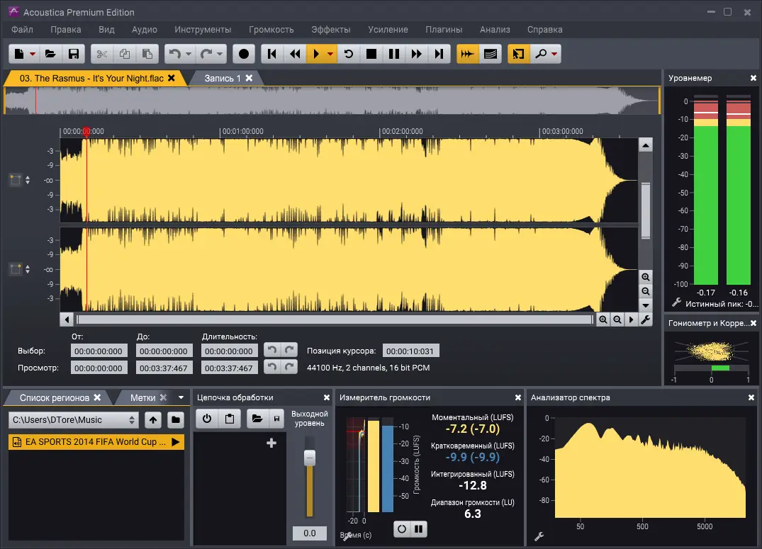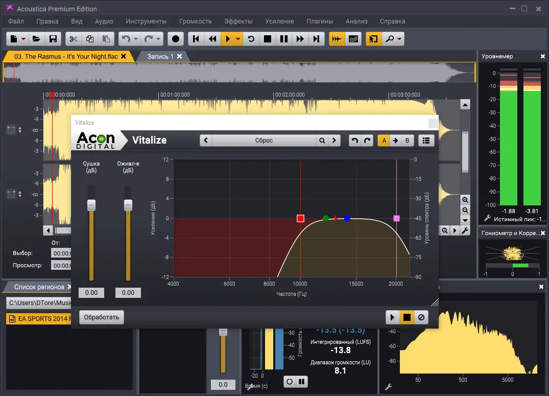 Acoustica предлагает мощный инструментарий для обработки звука, включая высококачественные алгоритмы растяжения времени и изменения тональности без потери качества. Встроенные плагины Studio Clean, Studio Time и Studio Necessities расширяют возможности по восстановлению и мастерингу аудио. Поддержка меток, маркеров и различных форматов времени (SMPTE, бары, биты) удобна при работе с музыкальными проектами. Программа также позволяет редактировать метаданные, включая ID3-теги для MP3, и поддерживает ACID-информацию, что важно для работы с циклами. Тем не менее, отсутствие родной русской локализации может вызвать трудности у некоторых пользователей, хотя сторонние решения, такие как русификатор, частично компенсируют этот недостаток.