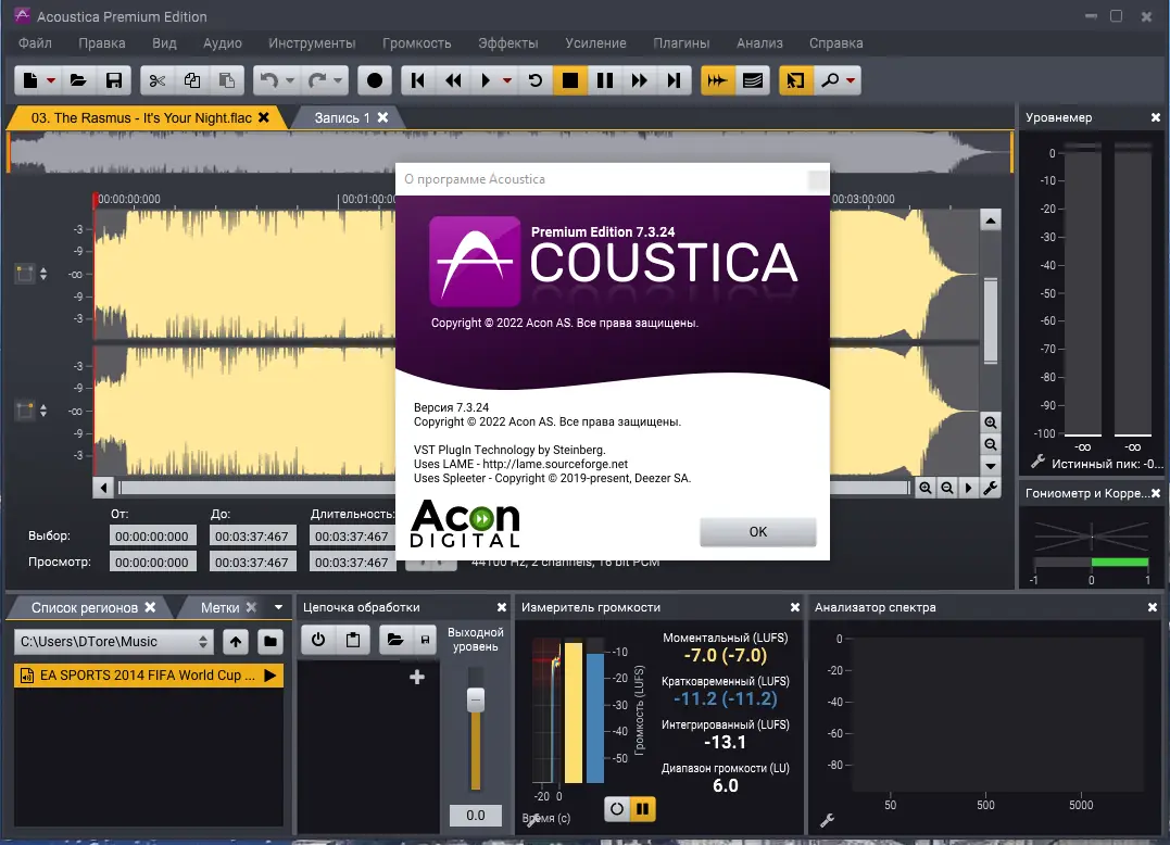 Acoustica — профессиональный аудиоредактор с поддержкой многоканального звука до 7.1 и частотой дискретизации до 384 кГц, предназначенный для записи, редактирования и мастеринга аудиофайлов. Программа предлагает широкий набор инструментов для обработки звука, включая шумоподавление, эквализацию, работу с метками и интеграцию сторонних плагинов. Поддержка форматов OGG, WAV, WMA, MP3 и AC3 позволяет легко конвертировать и редактировать аудио, а встроенные анализаторы обеспечивают точный контроль над качеством звучания.