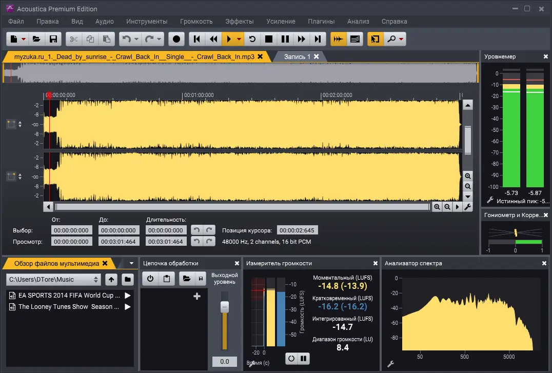 Использование Acoustica начинается с выбора источника записи — программа работает с любыми совместимыми Windows MME или ASIO-устройствами, что обеспечивает низкую задержку и стабильную запись. После загрузки аудиофайла доступны стандартные операции: вырезание, копирование, вставка, а также mix-редактирование с возможностью наложения фрагментов. В реальном времени можно применять эффекты, используя встроенный редактор, и прослушивать результат до финального экспорта. Для анализа звука предусмотрены инструменты: FFT-анализатор, коррелятор фаз, измеритель пикового уровня и RMS, а также визуализация спектрограммы и статистика сигнала. Это особенно полезно при реставрации старых записей или подготовке треков к записи на . Автоматическое разделение треков по тишине упрощает обработку длинных записей, а поддержка меток и маркеров помогает структурировать проект.