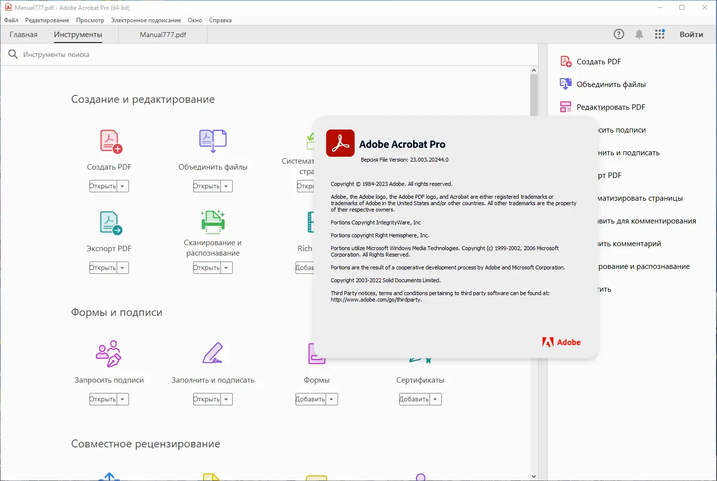 Adobe Acrobat — это передовое программное решение для работы с документами в формате PDF, объединяющее мощь настольного приложения, мобильного доступа и облачных сервисов. Программа позволяет создавать, редактировать, защищать и подписывать файлы PDF, обеспечивая полную совместимость между устройствами и операционными системами. Удобный интерфейс, поддержка сенсорного ввода и расширенные функции делают её незаменимой в деловой среде.