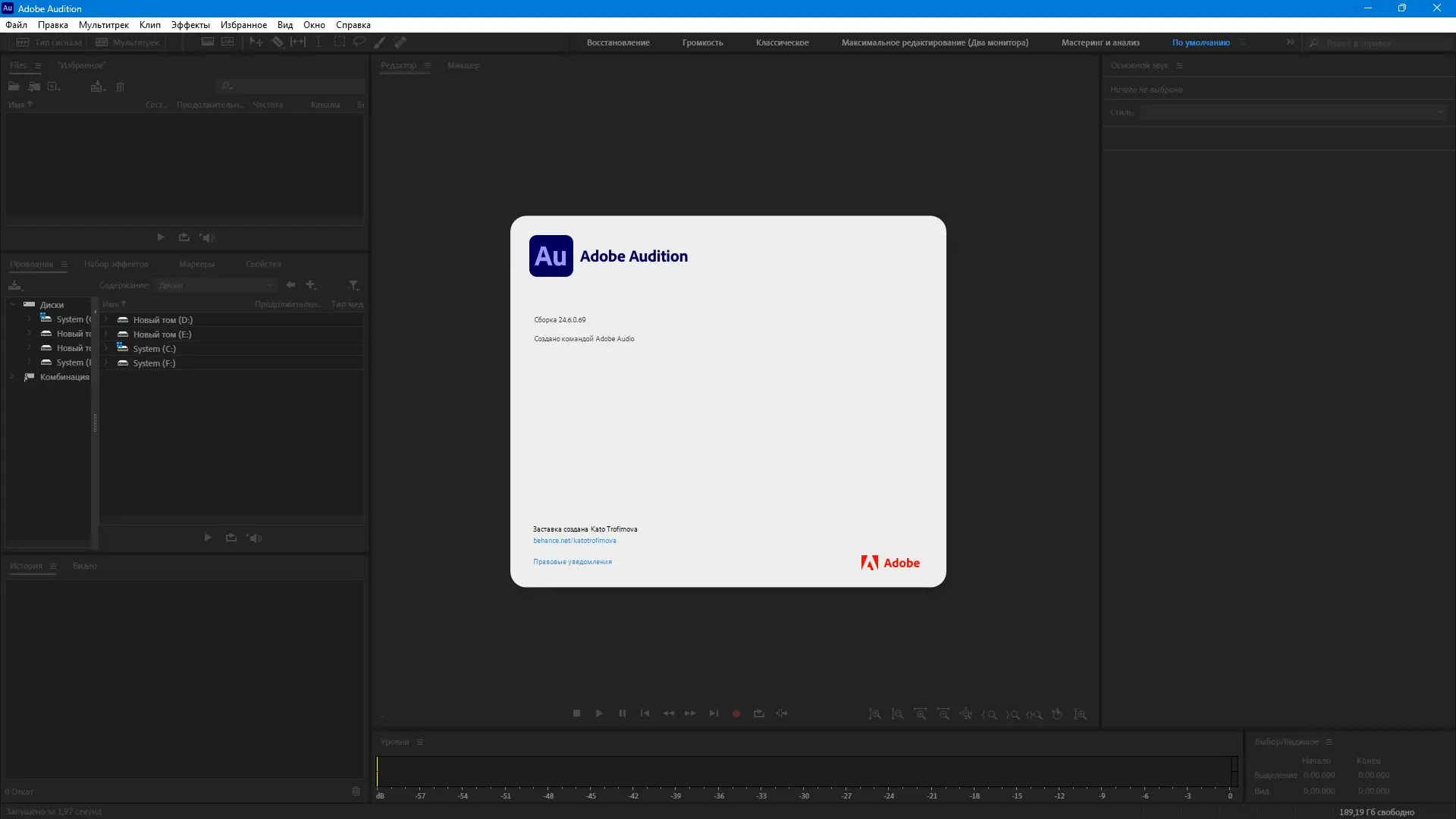 Adobe Audition — профессиональный аудиоредактор, предназначенный для обработки, микширования и создания высококачественных звуковых проектов. Программа поддерживает широкий спектр форматов, предлагает инструменты на основе технологии DSP и позволяет работать с аудио до 32-бит и 192 кГц, обеспечивая студийное качество звучания. Подходит как для аудиомонтажа, так и для создания саундтреков к видео.