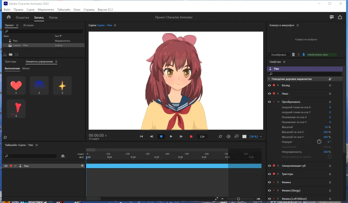 Запуск анимации начинается с импорта графического объекта, созданного в Photoshop или Illustrator. После импорта программа автоматически распознаёт слои и строит структуру марионетки, которую можно тонко настроить. Пользователь может задать позу покоя, активировать поведение «Лицо» и «Синхронизация губ», после чего начать запись, используя веб-камеру и микрофон. Во время записи фиксируются выражения лица, движения головы, моргание и речь. Управление также возможно с помощью клавиатуры и мыши — например, для активации определённых эмоций или движений. Записанные дубли сохраняются на таймлайне и могут быть экспортированы в виде изображений с прозрачным фоном и аудиофайла. Далее проект легко передаётся в After Effects для финальной обработки.