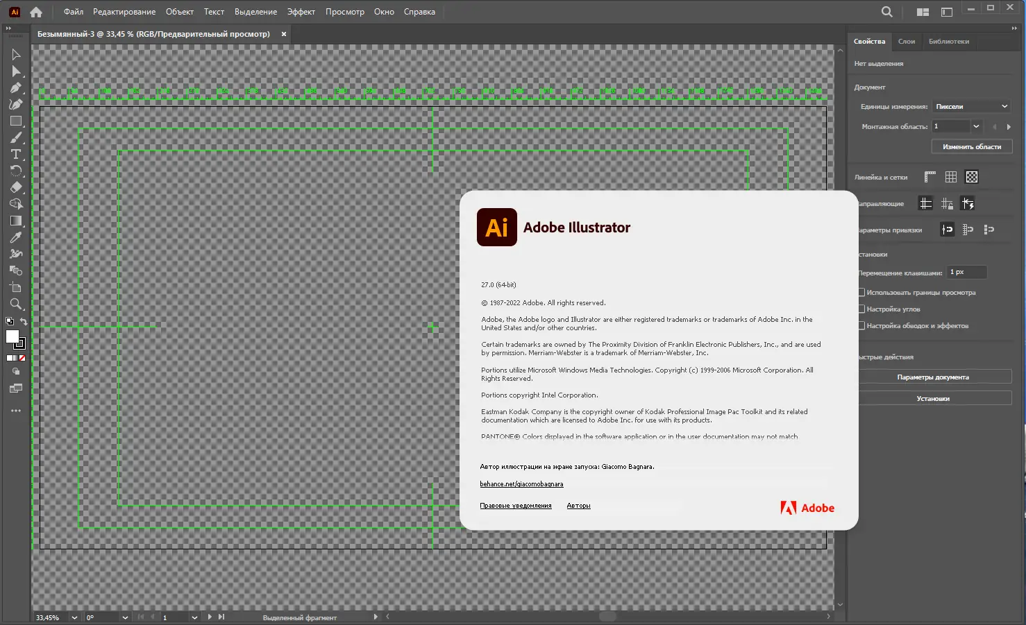 Adobe Illustrator 2022 — профессиональный векторный графический редактор с поддержкой современных стандартов и улучшенной производительностью благодаря системе Adobe Mercury Performance. Программа подходит для создания иллюстраций, логотипов, узоров, типографики и веб-дизайна с точностью до пикселя. Интерфейс адаптирован под эффективную работу с множеством монтажных областей и сложными проектами.