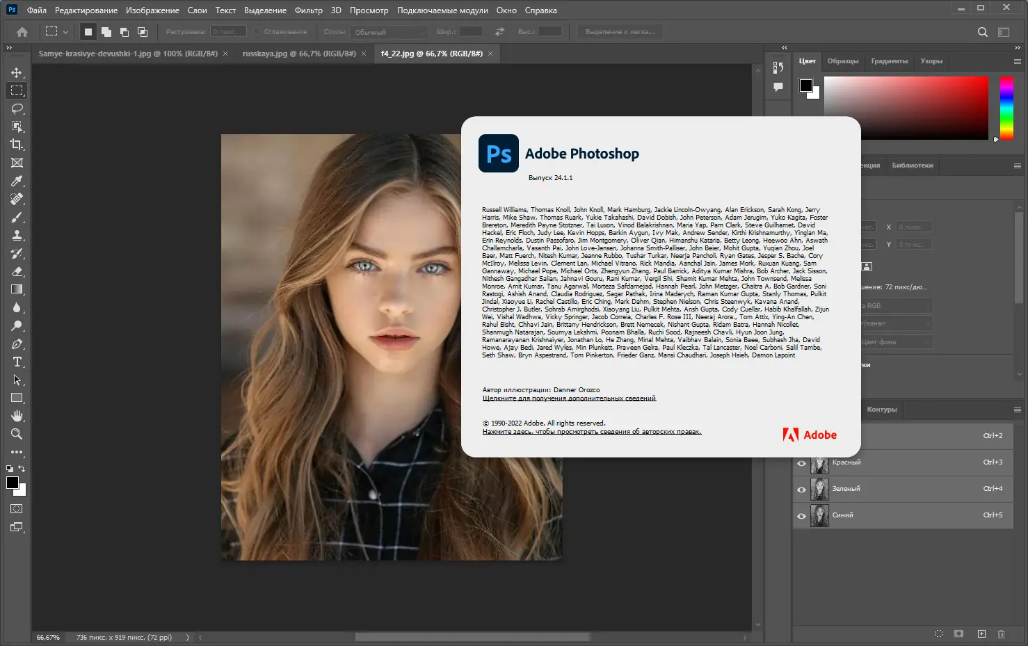 Adobe Photoshop 2023 — профессиональный редактор растровой графики, предназначенный для создания, редактирования и обработки изображений высокого качества. Программа поддерживает широкий спектр форматов, включая PSD, JPEG, PNG, TIFF, RAW и другие, обеспечивая гибкость в работе с цифровыми изображениями. Инструменты Photoshop позволяют выполнять цветокоррекцию, ретушь, создание коллажей, манипуляции с объектами и подготовку графики к печати. Обновлённая версия предлагает улучшенные функции на основе искусственного интеллекта, ускоренную работу с облачными документами и расширенные возможности для совместной работы.