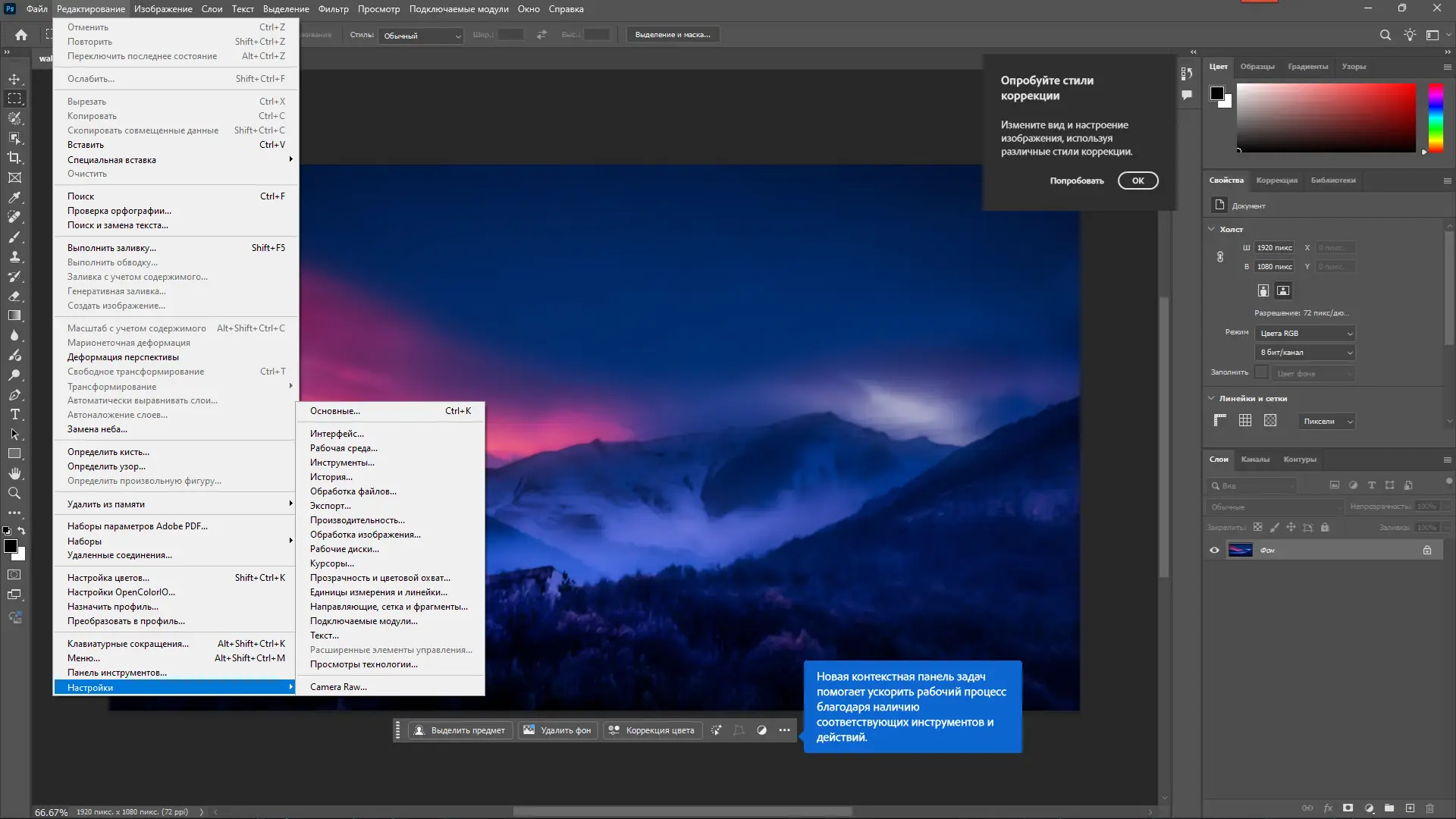 Adobe Photoshop 2025 — мощный инструмент для работы с растровой графикой, предназначенный для создания, редактирования и обработки изображений высокого качества. Программа поддерживает широкий спектр графических форматов и предлагает продвинутые функции для цветокоррекции, ретуши, коллажирования и подготовки материалов к печати. Версия на русском языке доступна для пользователей, предпочитающих интерфейс на родном языке.