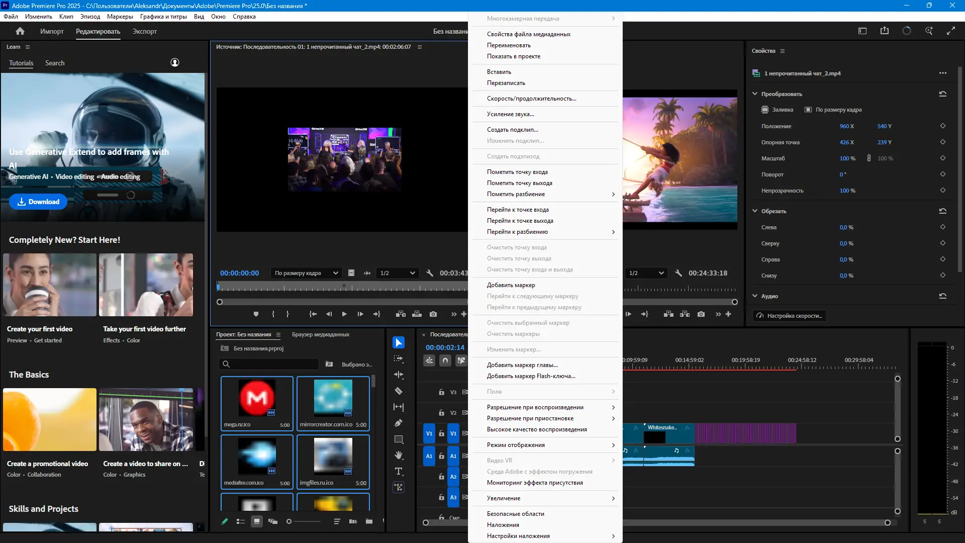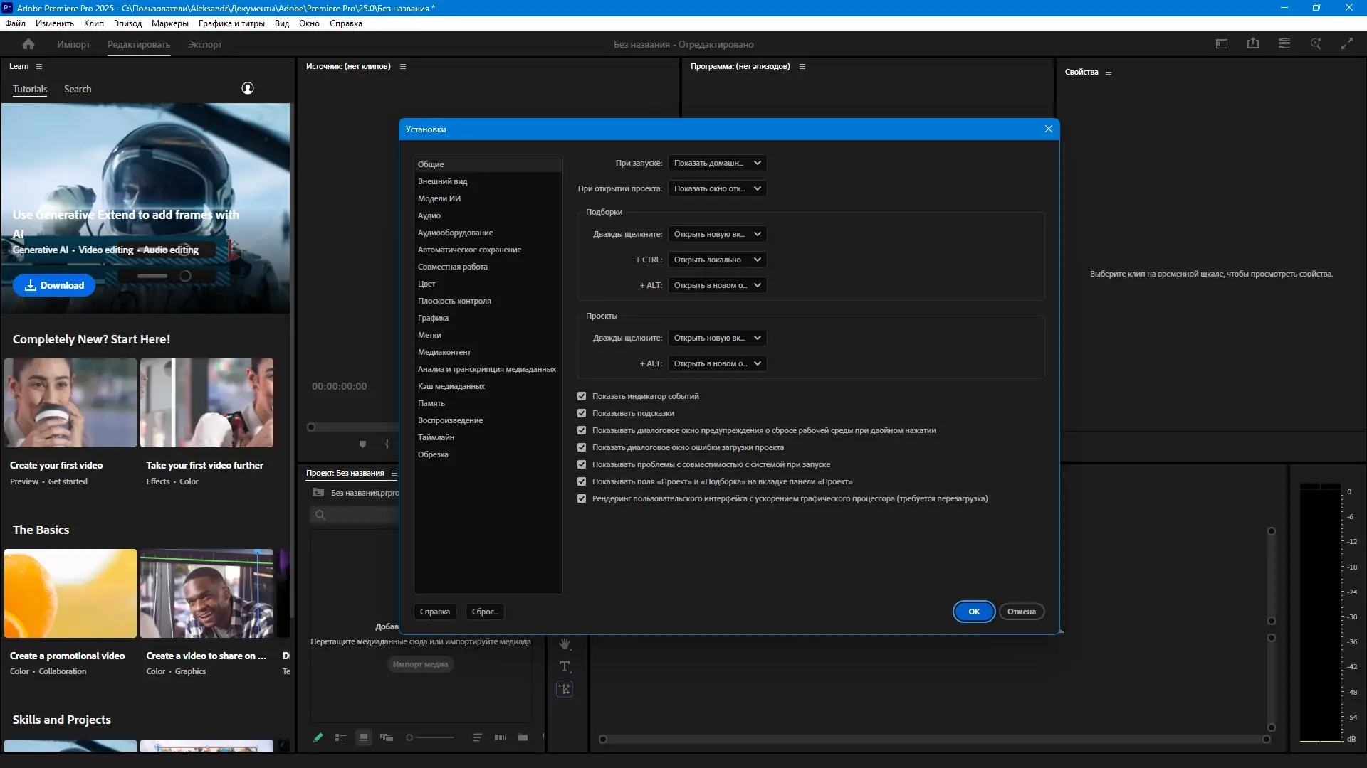 Первое знакомство с интерфейсом начинается со стартового окна, где доступны шаблоны проектов, обучающие материалы и примеры готовых монтажей. Для добавления медиафайлов используется браузер медиатеки, в котором можно импортировать отдельные клипы или объединённые последовательности. Таймлайн поддерживает многодорожечное редактирование, точные разрезы, вставки и применение переходов с возможностью настройки кривых анимации.