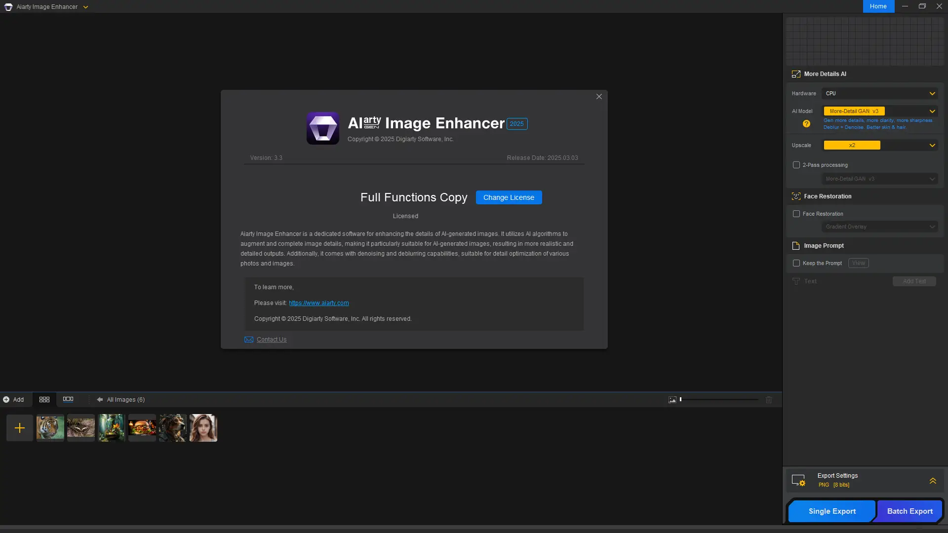 Программное обеспечение Aiarty Image Enhancer разработано компанией Digiarty Software как инструмент для качественного улучшения изображений с использованием передовых ИИ-моделей. Оно способно повышать разрешение изображений до 8 крат, при этом сохраняя реалистичность текстур кожи, волос и тканей. Технология генеративного ИИ позволяет не просто растягивать пиксели, а создавать новые детали, основываясь на анализе исходного изображения.