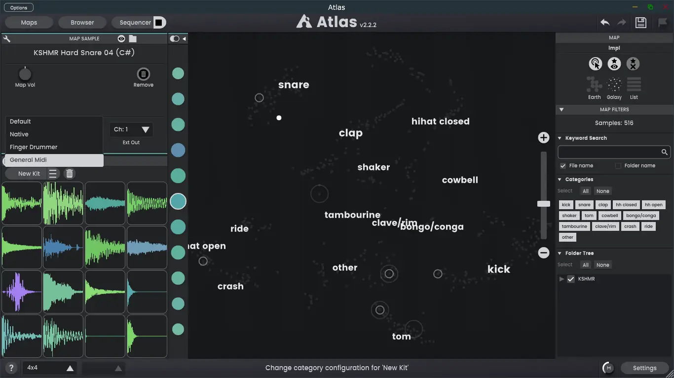 Использование Algonaut начинается с анализа имеющихся семплов: достаточно указать папки с аудиофайлами, и система автоматически создаст карту назначений. Далее можно просматривать семплы в режиме Galaxy, где каждый звук представлен точкой, масштабируя область для детального изучения. Для создания драмкита используется функция Smart Kit — одно нажатие генерирует комплект из восьми подходящих по стилю звуков, которые можно редактировать или заменять перетаскиванием.