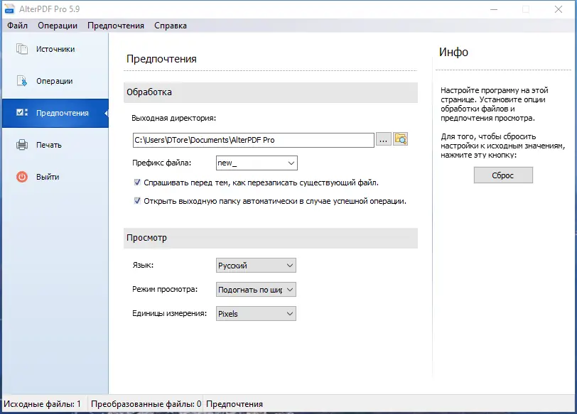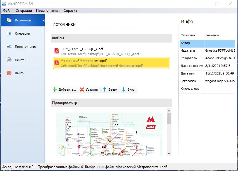 Интерфейс программы интуитивно понятен и не перегружен лишними элементами. Все основные функции доступны через главное меню, где каждая операция сопровождается понятным диалогом настройки. Для выполнения конвертации достаточно выбрать нужный режим, добавить файлы и указать параметры вывода. Поддержка drag-and-drop позволяет быстро загружать документы, перетаскивая их в окно приложения. Работа с метаданными осуществляется через отдельное окно, где можно изменить автора, название, ключевые слова и другие параметры документа. Печать PDF выполняется напрямую из интерфейса, что исключает необходимость открывать дополнительные приложения. Расшифровка защищённых файлов возможна при наличии пароля, а функция шифрования позволяет задать права на копирование и печать.