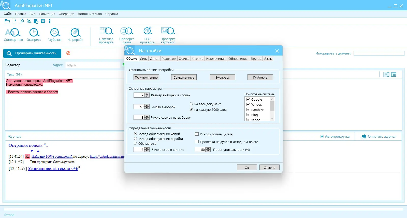 AntiPlagiarism.NET сочетает в себе высокую точность анализа и удобный интерфейс, что делает его надёжным помощником в работе с текстовым контентом. Программа позволяет гибко настраивать параметры проверки, включая длину шингла, порог уникальности и размер выборки, что особенно ценно при работе с узкоспециализированными текстами. Поддержка прокси и автоматическое распознавание капчи предотвращают блокировку со стороны поисковых систем даже при массовых запросах. Также доступна функция сохранения отчётов, что удобно для архивирования и последующего сравнения версий текстов.