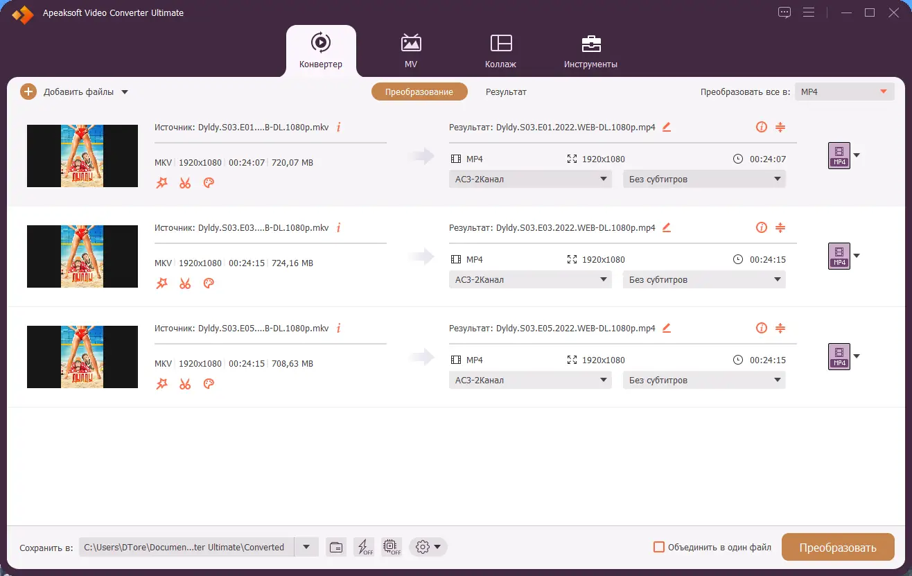 Apeaksoft Video Converter Ultimate — универсальный конвертер видео и аудио с расширенными функциями редактирования, поддерживающий форматы 8K, 4K UHD, HD и SD. Программа преобразует файлы для воспроизведения на смартфонах, планшетах, игровых приставках и других устройствах. Встроенный видеоредактор позволяет обрезать клипы, менять параметры изображения и звука, добавлять водяные знаки и объединять ролики.