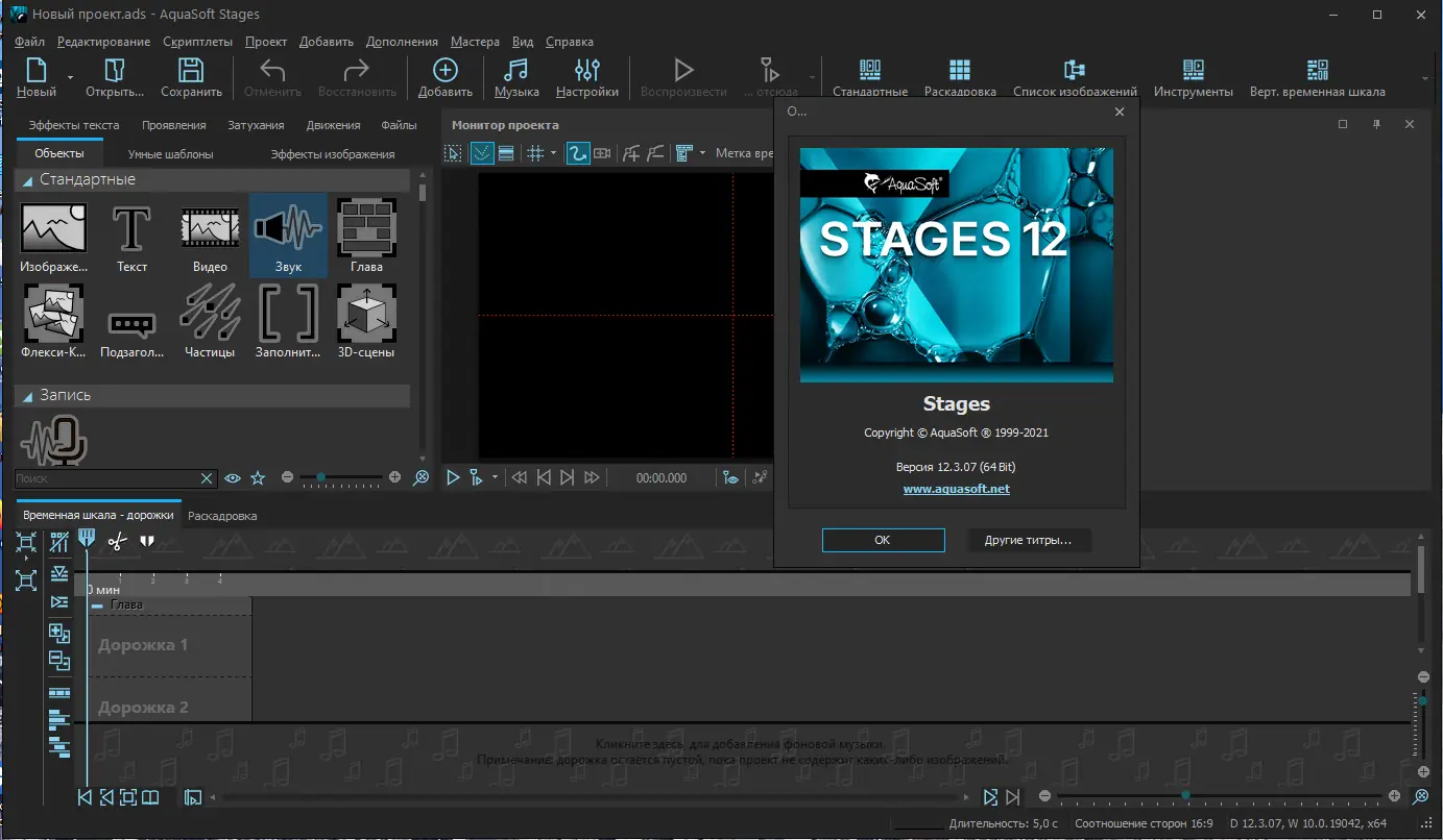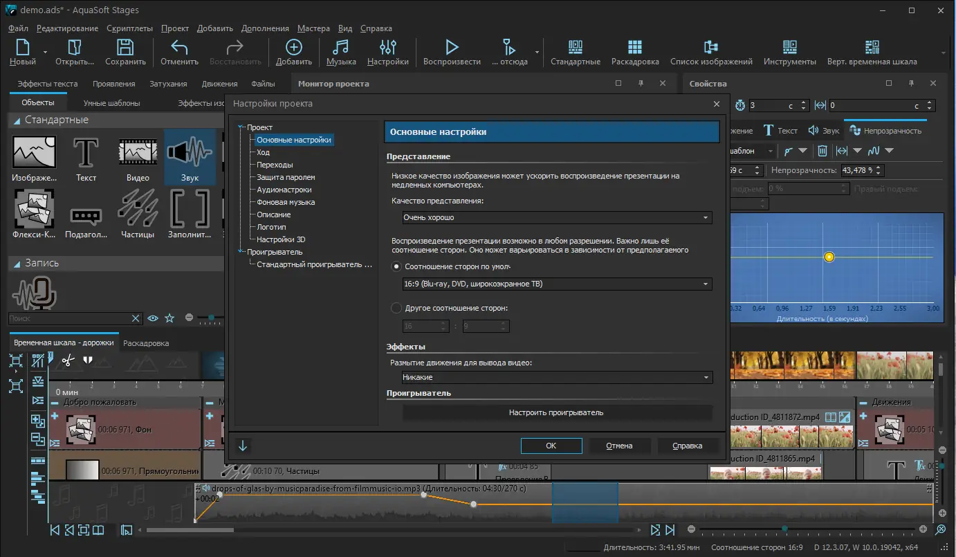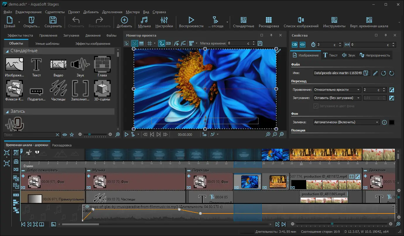 AquaSoft Stages разработана для тех, кто стремится превратить обычные фото- и видеоматериалы в кинематографические произведения. Она объединяет в себе функции видеоредактора, слайд-шоу-мастера и анимационной платформы, позволяя создавать проекты с детальным контролем над каждым элементом. Интерфейс ориентирован на точную настройку параметров во времени, что особенно важно при работе с синхронизацией музыки и движения объектов.
