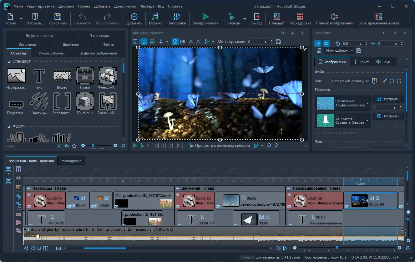 AquaSoft Stages — это профессиональный инструмент для создания анимированных презентаций и слайд-шоу, сочетающий в себе расширенные функции анимации, точную синхронизацию с музыкой и поддержку высококачественного видеоэкспорта. Программа подходит как для фотографов, так и для видеомонтажёров, позволяя легко комбинировать фото, видео, текст и аудиодорожки в единый динамичный проект. Благодаря интуитивной временной шкале и обширной библиотеке визуальных эффектов, создание сложных композиций становится доступным даже без глубоких навыков в монтаже.