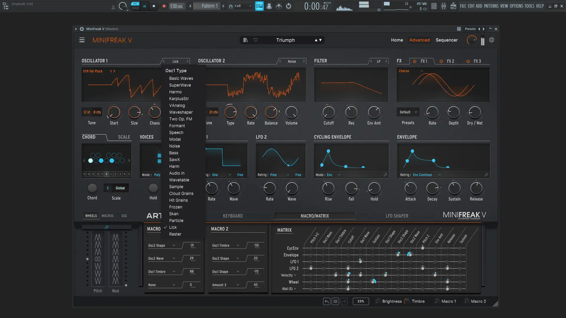 Программа предлагает широкий спектр инструментов для глубокого звукового экспериментирования, при этом сохраняя доступность для пользователей разного уровня. Её архитектура поддерживает как предсказуемое моделирование звуков, так и генерацию непредсказуемых, хаотичных паттернов, что особенно ценно в импровизационной музыке. Встроенные стереоэффекты, такие как реверберация, задержка и модуляция, дополняют общий звуковой образ, делая внешнюю обработку не всегда необходимой.