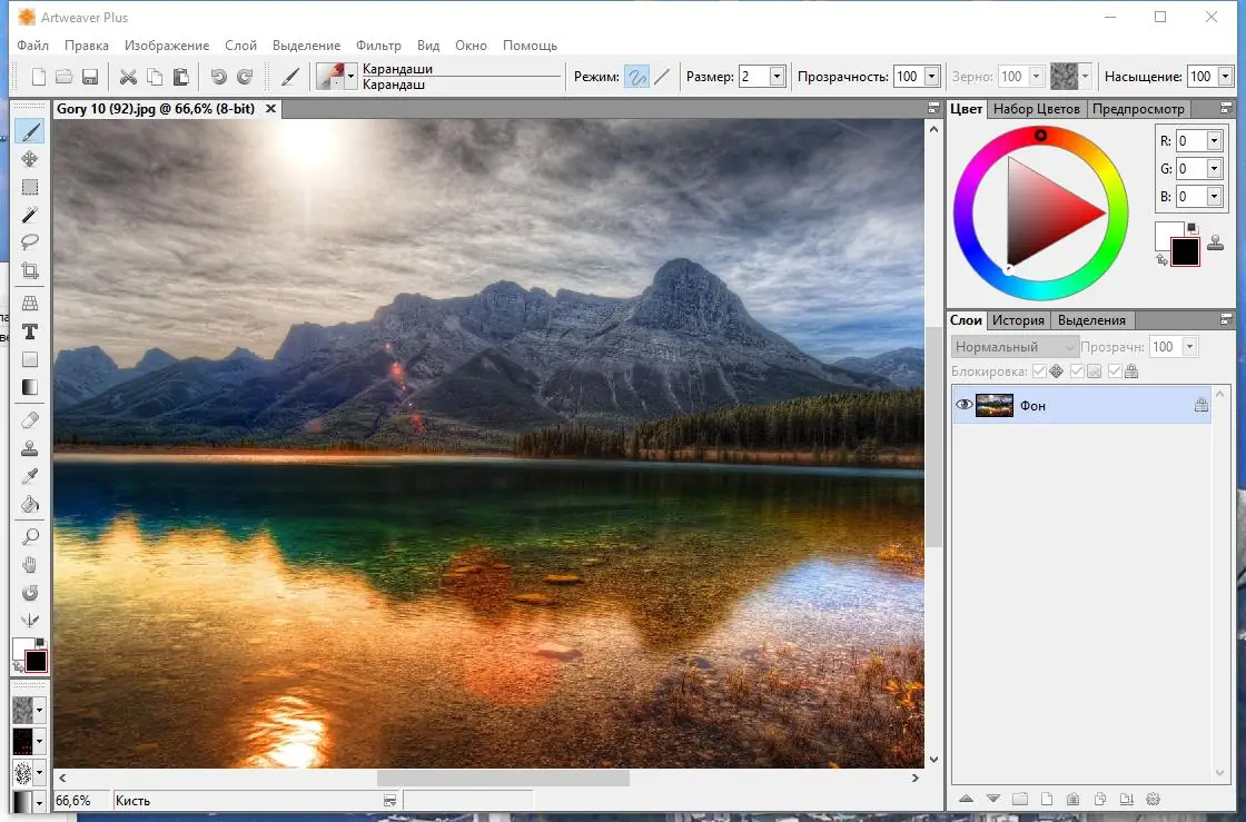 - Стандартные инструменты: градиент, лассо, волшебная палочка, кисть, карандаш.