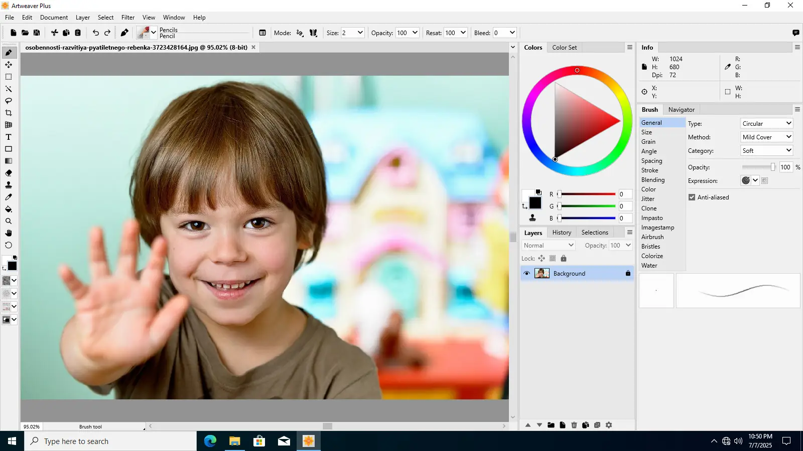 - Гибкая настройка параметров кистей: размер, жёсткость, прозрачность, текстура