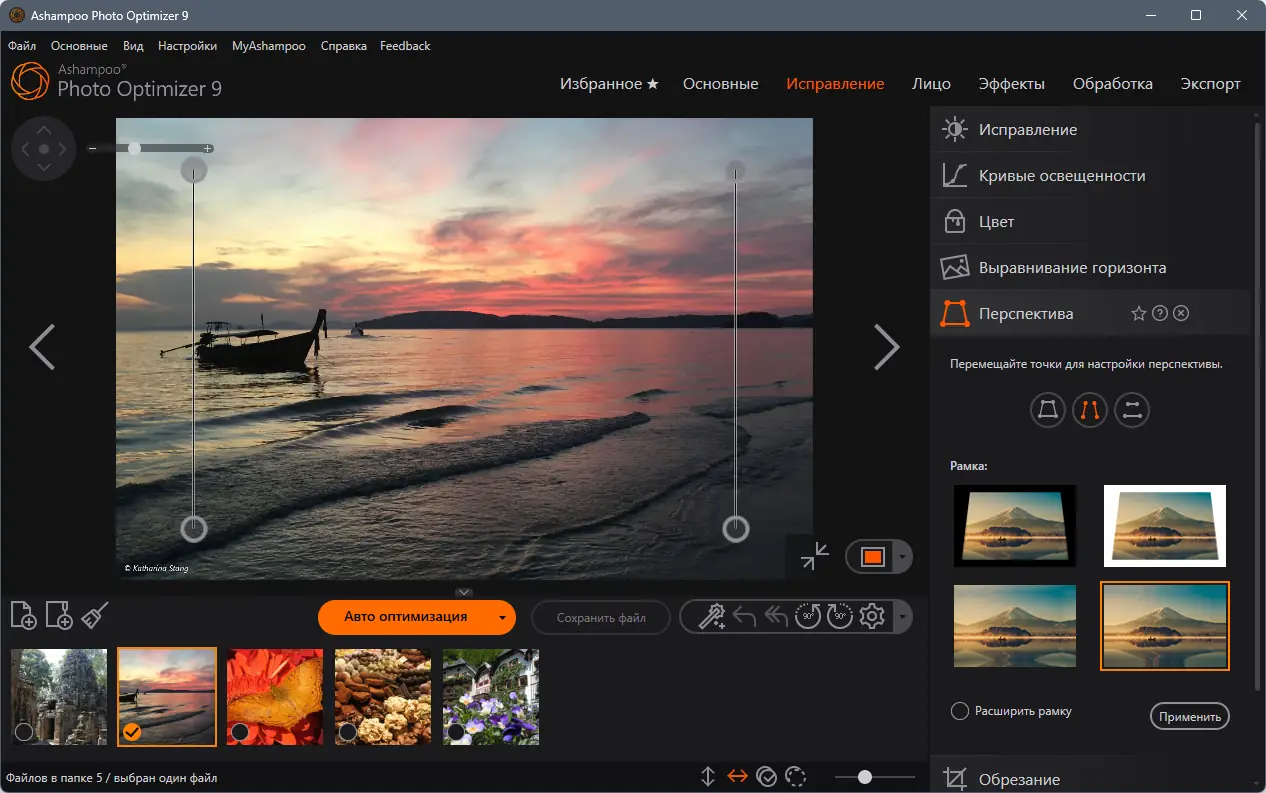 Ashampoo Photo Optimizer 9 — это программа для автоматического и ручного улучшения фотографий с интуитивным интерфейсом и широким набором инструментов. Она справляется с цветокоррекцией, исправлением перспективы, устранением дефектов и пакетной обработкой изображений. Подходит как новичкам, так и опытным пользователям, позволяя достигать качественных результатов быстро и без лишних усилий.