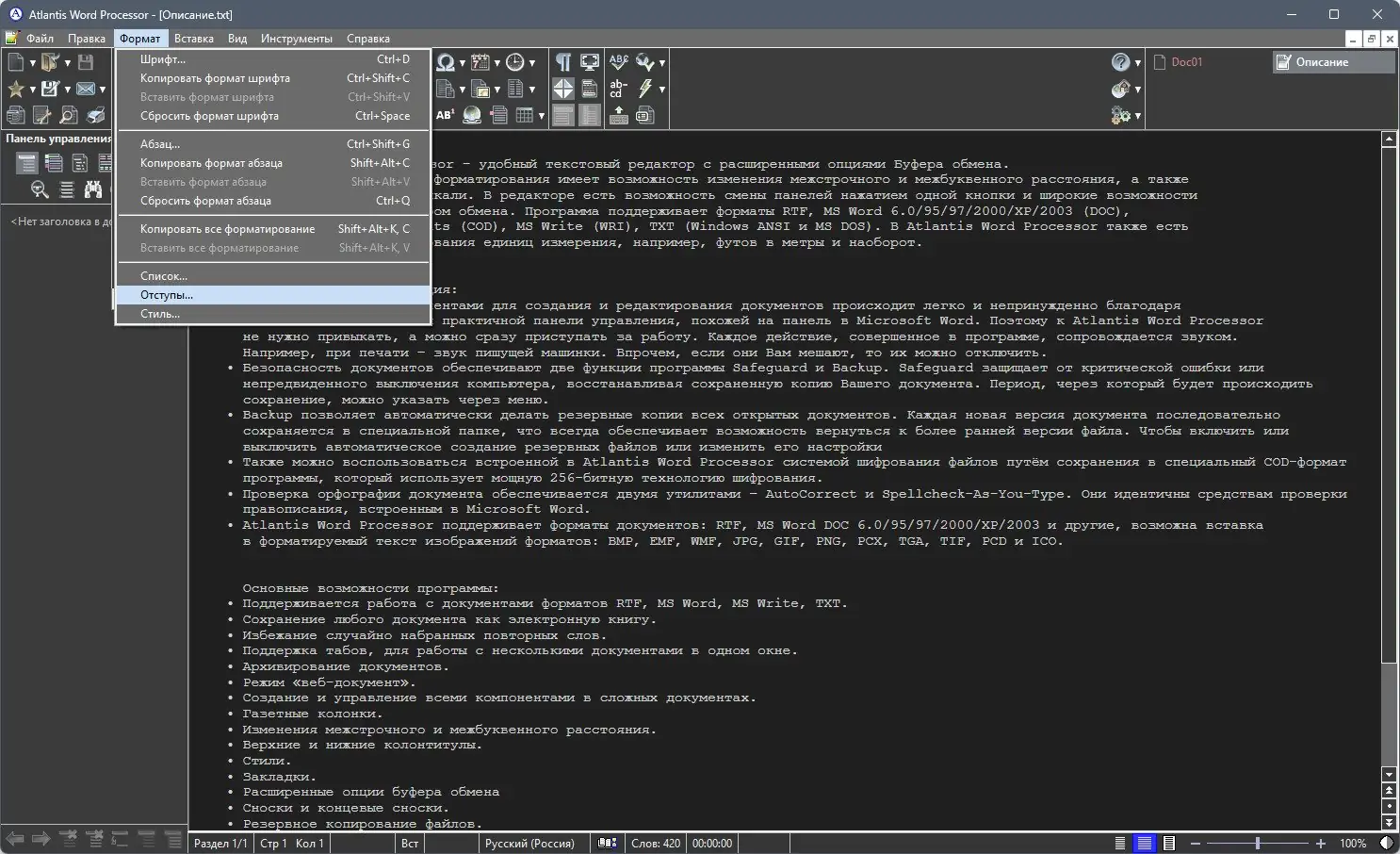 Atlantis Word Processor — это многофункциональный текстовый редактор, разработанный для эффективной работы с документами различных форматов. Программа сочетает в себе мощные инструменты форматирования, поддержку современных стандартов файлов и высокий уровень защиты данных. Её интерфейс интуитивно понятен, а функционал охватывает как базовые, так и продвинутые задачи делопроизводства.