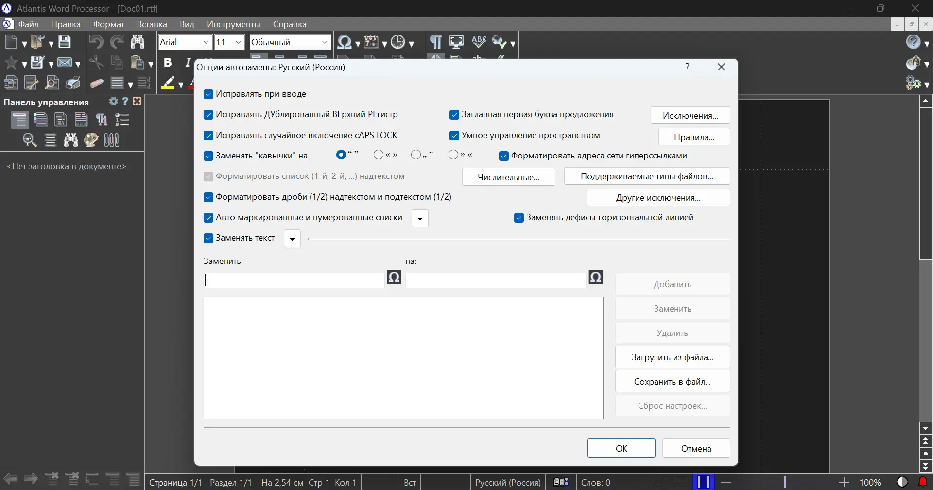 - Автоматическая проверка орфографии с поддержкой русского языка и функцией автозамены.