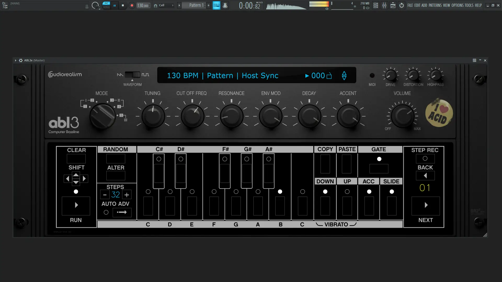 Работа с ABL3 начинается с настройки базового звучания через осциллятор и фильтр, где доступны все ключевые параметры, включая частоту среза, резонанс и огибающую. Секвенсор активируется в соответствующем режиме, где можно записывать шаги вручную или использовать функцию пошаговой записи через MIDI. Для создания динамичных партий доступны кнопки вибрато, активируемые комбинацией «Вверх» и «Вниз» на нужном шаге, а также функция сдвига всей последовательности с помощью клавиш Shift.