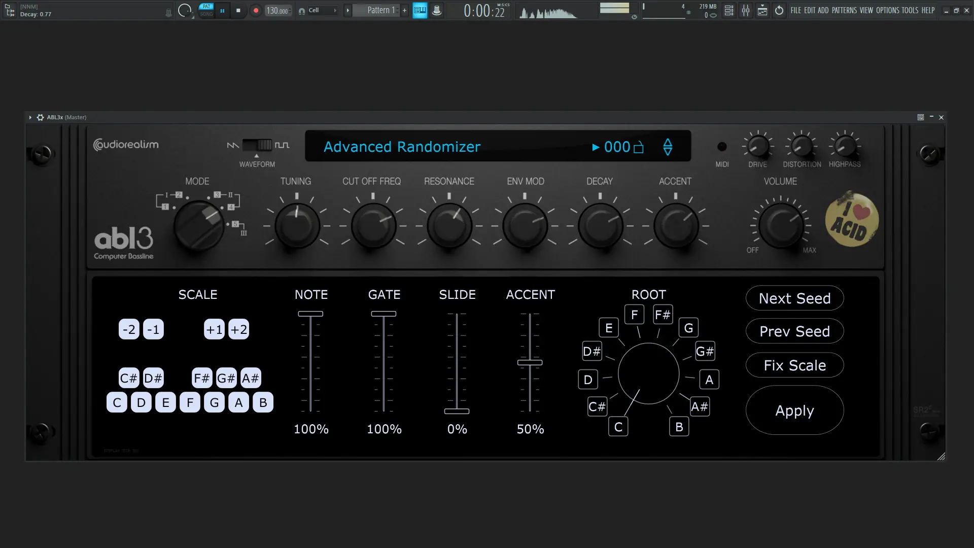 - Генератор паттернов включает встроенный рандомайзер, способный создавать музыкально осмысленные последовательности в заданной структуре.