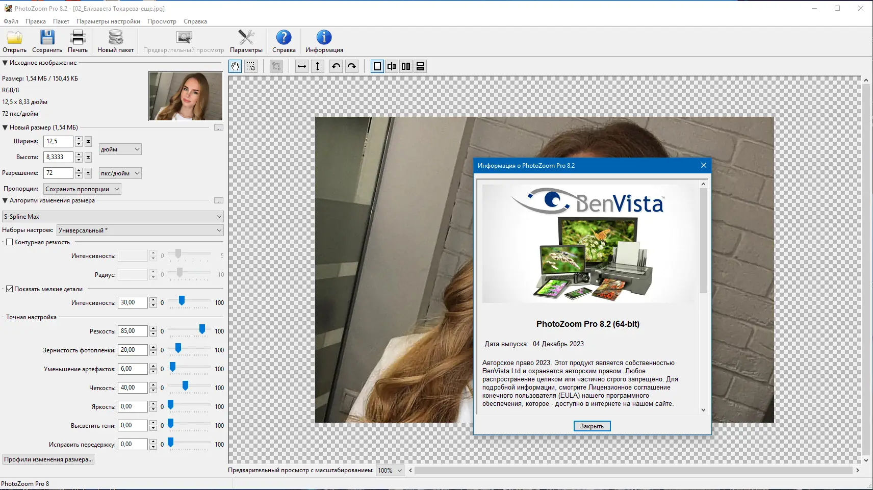 Benvista PhotoZoom — это мощное программное решение для увеличения и уменьшения цифровых изображений с сохранением высокой детализации. В основе работы лежит запатентованная технология S-Spline Max, которая анализирует структуру изображения и адаптивно восстанавливает недостающие пиксели. Это позволяет избежать характерной зернистости, размытости и лестничного эффекта, часто возникающих при стандартных методах интерполяции. Программа поддерживает широкий спектр графических форматов, включая TIFF, JPEG, PNG, RAW и другие, что делает её универсальной в использовании.
