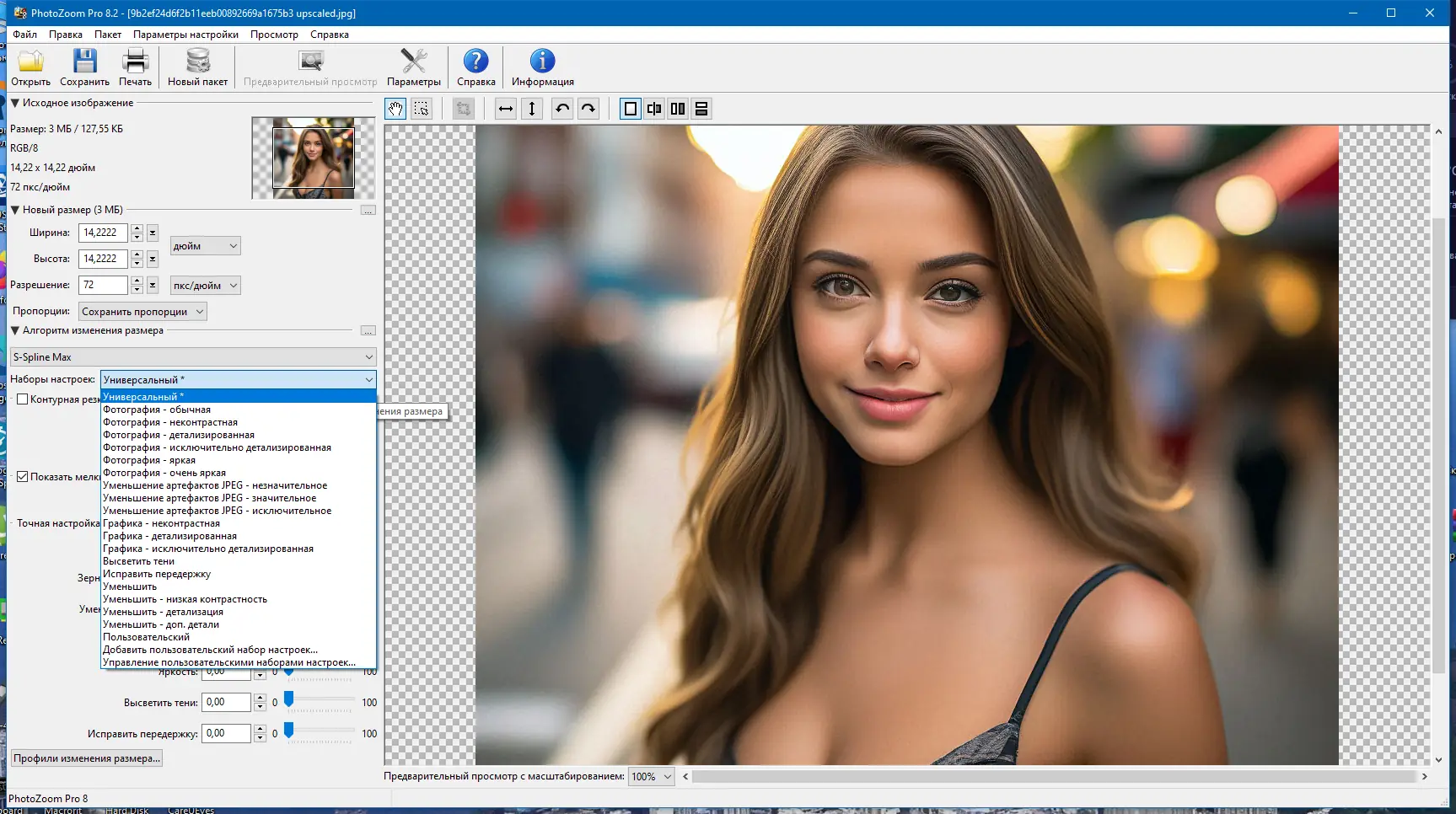 Использование программы начинается с загрузки изображения через интерфейс или перетаскивание файла. Пользователь задаёт нужные размеры выходного изображения, выбирает подходящий метод масштабирования из предложенных профилей — например, для портретов, пейзажей или графических элементов. Встроенное окно предпросмотра в реальном времени позволяет оценить результат до применения изменений. Дополнительные настройки, такие как коррекция шума, зернистости и живости, дают возможность тонкой настройки конечного результата. После настройки параметров изображение можно сохранить в нужном формате или отправить напрямую в Photoshop или Lightroom через плагин.