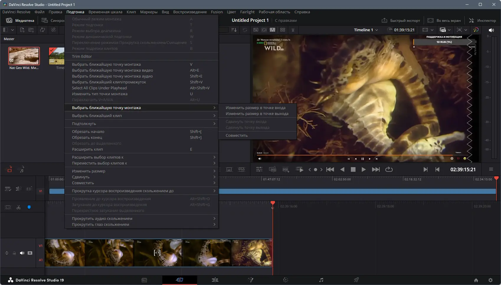 Работа с программой организована через специализированные страницы интерфейса: «Монтаж», «Сборка», «Цвет», «Fusion», «Fairlight», «Мультимедиа» и «Экспорт». Каждая страница предоставляет доступ к инструментам, необходимым для конкретного этапа. На странице «Монтаж» выполняется основное редактирование, включая обрезку, добавление переходов и титров. «Сборка» оптимизирована для быстрого монтажа, особенно подходит для документальных проектов. Страница «Цвет» предоставляет профессиональные инструменты грейдинга, включая HDR-диаграммы и квалификаторы. Fusion позволяет создавать сложные композиции на узловой основе, а Fairlight — полноценная DAW для работы со звуком. Все изменения синхронизируются в реальном времени, позволяя команде работать параллельно.