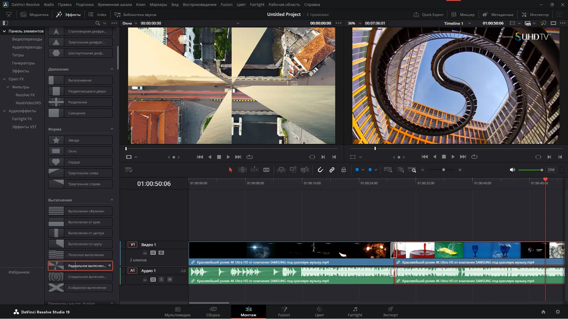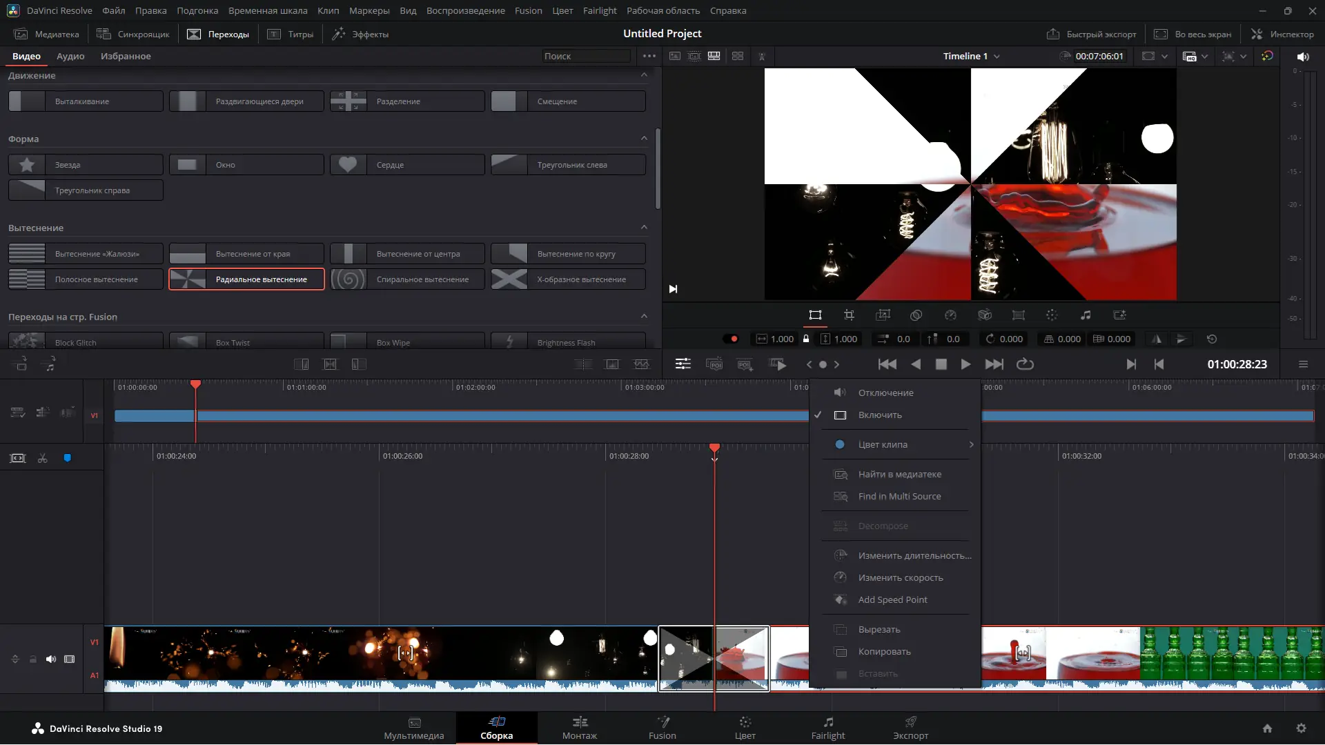 - Разделы интерфейса организованы по функциональному принципу: монтаж, цвет, звук, Fusion, экспорт.