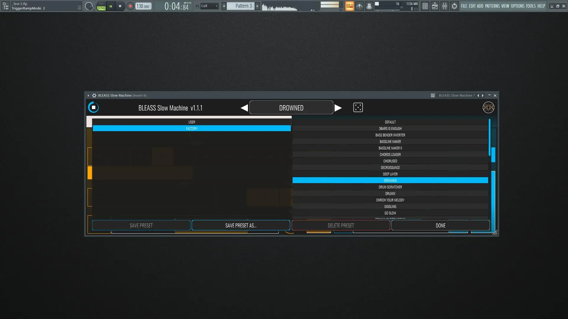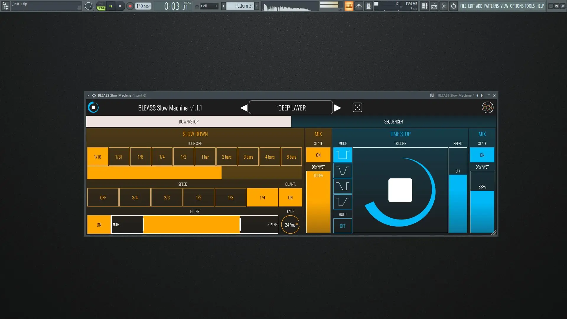 - Модуль Slow Down изменяет темп и высоту тона с возможностью настройки размера цикла, фильтрации и плавного перехода между повторами.