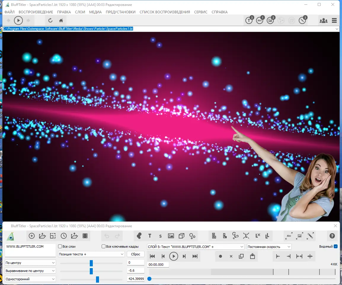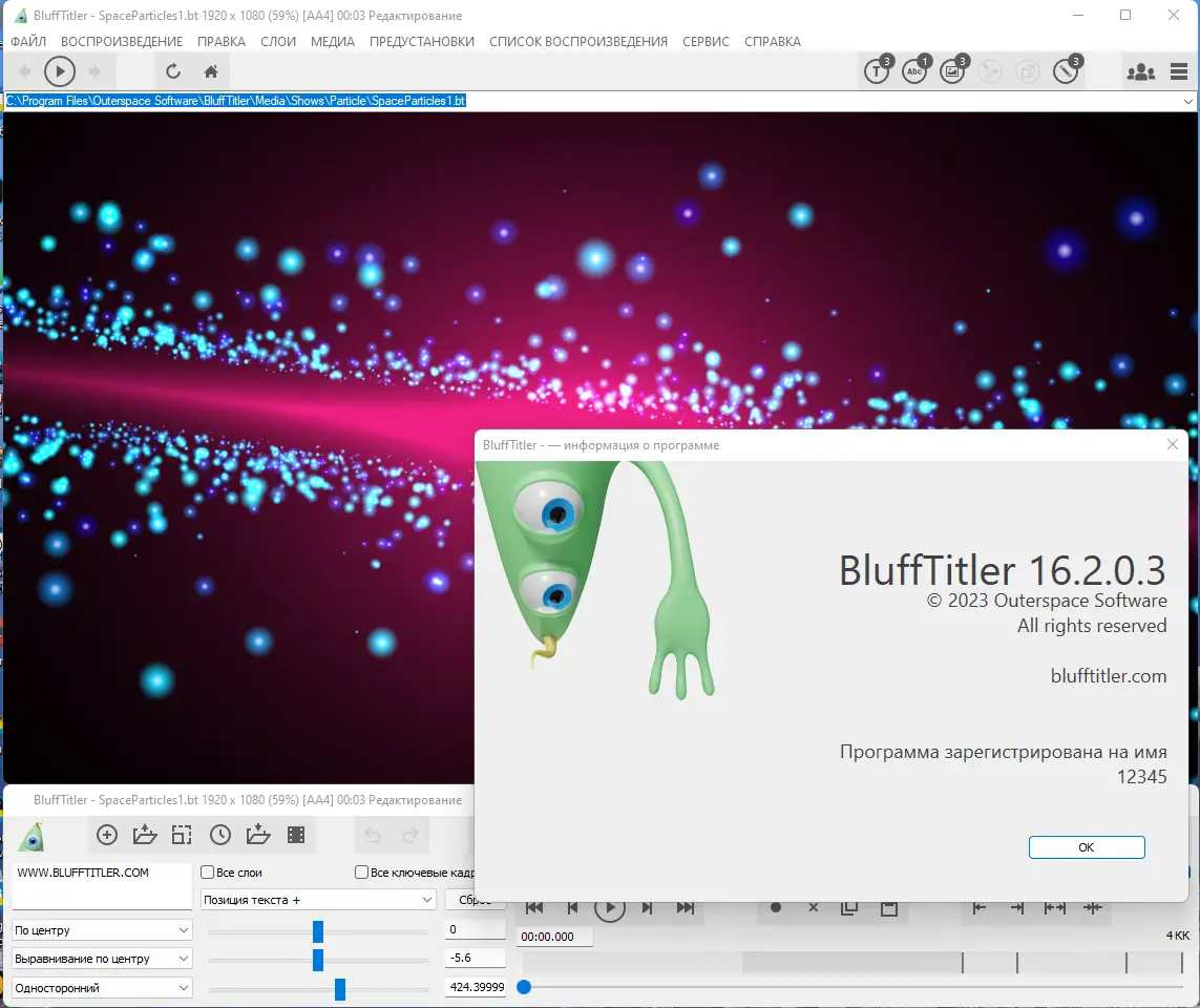 BluffTitler — это мощный инструмент для создания трёхмерных титров и анимированных текстовых эффектов, подходящий как для новичков, так и для опытных видеомонтажёров. Программа позволяет в реальном времени визуализировать проекты и экспортировать их в популярные видеоформаты с поддержкой альфа-канала. Благодаря модульному подходу к построению сцен, каждый элемент остаётся независимым и легко редактируемым.