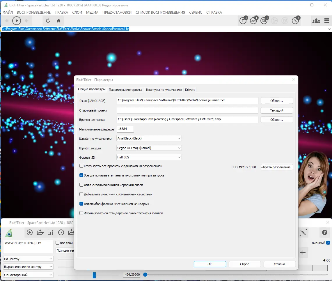 Работа в BluffTitler начинается с создания нового проекта и добавления необходимых слоёв через меню Layer. Текстовые слои настраиваются с учётом стиля, шрифта, кегля, интерлиньяжа и трёхмерного положения в пространстве. Для анимации параметров используется шкала времени, где устанавливаются ключевые кадры — программа автоматически рассчитывает переходы между ними. Эффекты вроде свечения, затенения или деформации применяются через встроенные пресеты или ручную настройку свойств. Взаимодействие слоёв достигается за счёт привязки — например, текстура плазмы может быть прикреплена к букве, создавая эффект горения. Экспорт завершает процесс, позволяя сохранить результат как видеофайл или набор кадров.