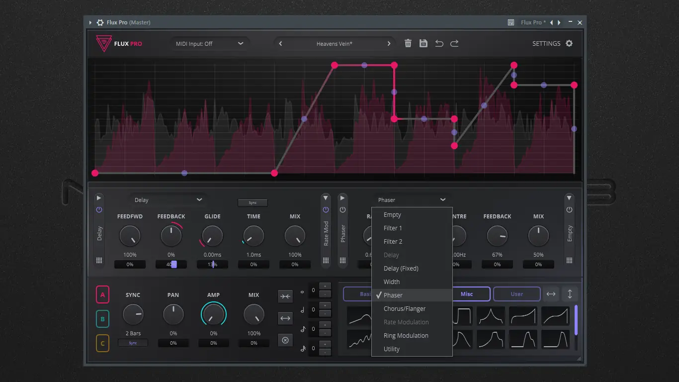 Работа с плагином начинается с установки на целевую аудиодорожку в цифровой аудиорабочей станции. Пользователь выбирает один из десяти доступных эффектов — таких как фазер, хорус, задержка или кольцевая модуляция — и назначает его на один из четырёх слотов. Каждый параметр эффекта можно модулировать через один из трёх графиков, где глубина воздействия настраивается индивидуально. Для ускорения процесса можно применить одну из 48 предустановленных форм модуляции, просто перетащив её на нужный график. Также доступна синхронизация с темпом проекта, что особенно полезно при создании пульсирующих ритмических паттернов. MIDI-управление позволяет привязывать активацию эффектов к проигрыванию нот, например, для динамического выделения инструментов в миксе.