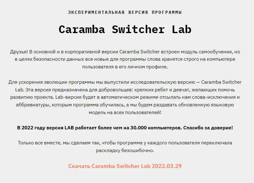 Caramba Switcher предлагает ряд технологических преимуществ по сравнению с аналогами, включая высокую точность переключения и отсутствие необходимости в ручной настройке. Программа эффективно экономит время, устраняя необходимость исправлять ошибки ввода, что особенно ценно при активной переписке или написании текстов. Благодаря встроенной функции самообучения, она становится всё точнее с каждым днём. При этом разработчики продолжают улучшать языковую модель, собирая анонимные данные в Lab-версии от добровольцев. Это делает продукт живым и развивающимся инструментом.
