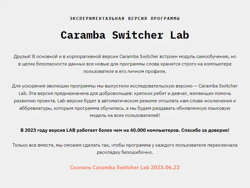 Программа доступна для установки на устройства под управлением Windows, а также в перспективе планируется поддержка mac os. Пользователи могут бесплатно протестировать базовую версию или присоединиться к Lab-версии для участия в улучшении языковых алгоритмов. Официальный сайт предоставляет актуальные версии для всех поддерживаемых платформ, включая сборки для corporate-сред. Процесс установки прост и не требует специальных знаний. Чтобы скачать Caramba Switcher, достаточно перейти на страницу загрузки и выбрать подходящую конфигурацию для windows или mac.