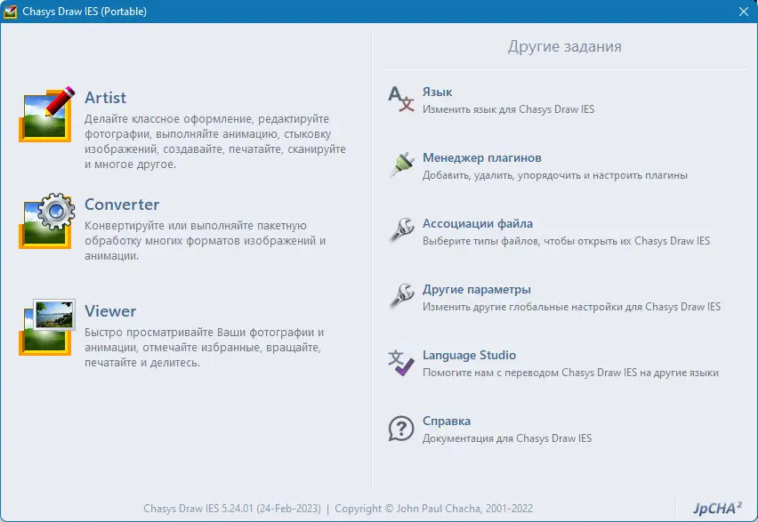 Chasys Draw IES представляет собой комплексное решение для обработки растровой графики, сочетающее в себе мощь профессионального редактора и удобство интегрированных утилит. Основной компонент — Chasys Draw IES Artist — работает с многослойными изображениями, поддерживает альфа-каналы, режимы наложения и корректирующие слои с несколькими эффектами на одном уровне. Движок JpDRAW2 обеспечивает высокую скорость отрисовки даже при работе с тяжёлыми проектами, включая анимацию и изображения с высокой детализацией.