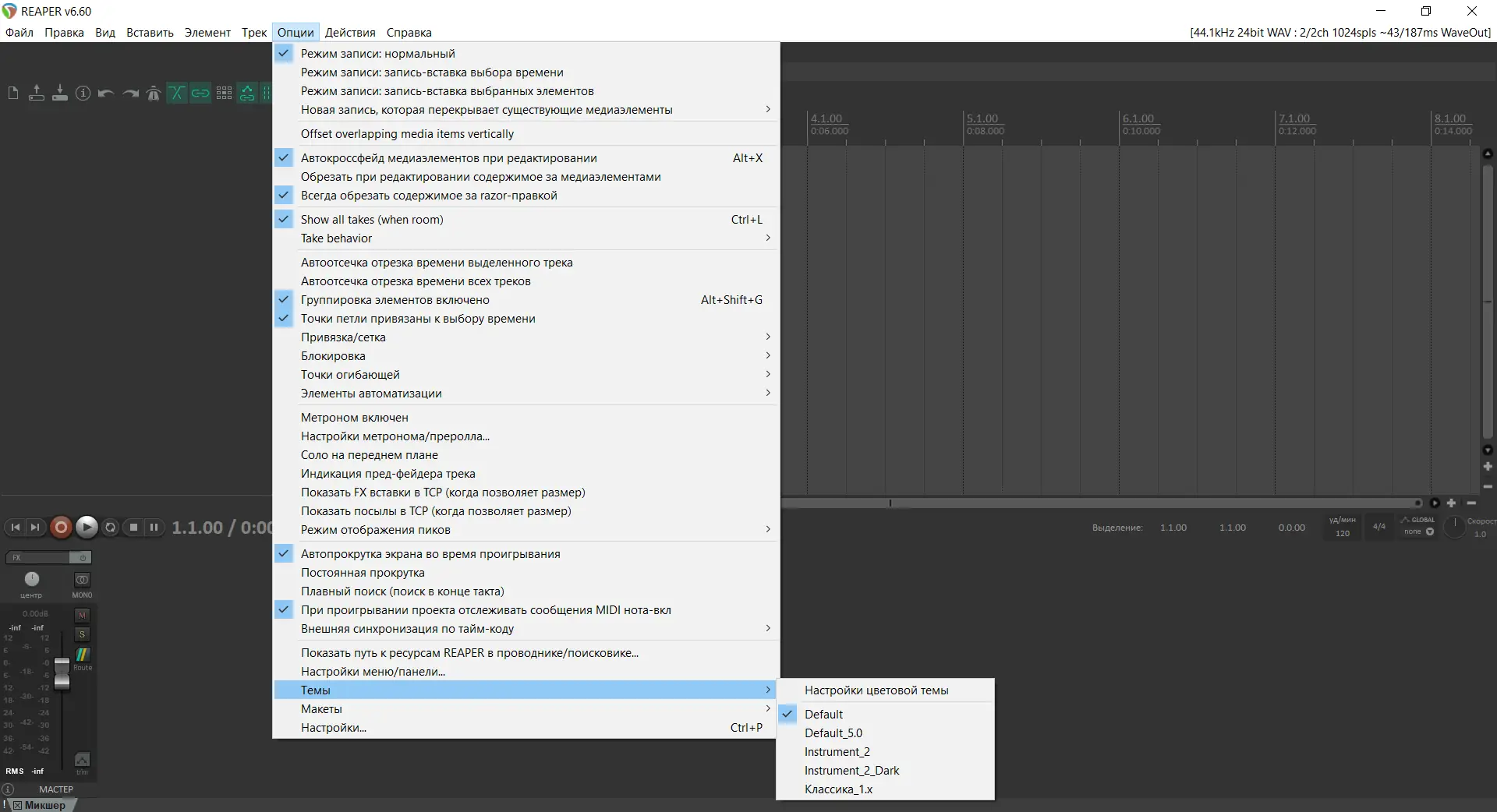 После запуска REAPER открывает доступ к многофункциональному рабочему пространству, где можно создавать новые проекты, импортировать аудио и MIDI, настраивать маршрутизацию и подключать плагины. Интерфейс легко адаптируется под нужды пользователя: панели инструментов, цветовые схемы, расположение треков и элементов управления настраиваются вручную. Редактирование осуществляется как с помощью мыши, так и через систему горячих клавиш, которую можно полностью перенастроить. Поддерживаются как аудиоклипы, так и MIDI-последовательности с возможностью применения VST-инструментов и эффектов. Проекты можно экспортировать в различные форматы, включая WAV, MP3, FLAC и другие, с выбором битрейта, частоты дискретизации и глубины цвета.