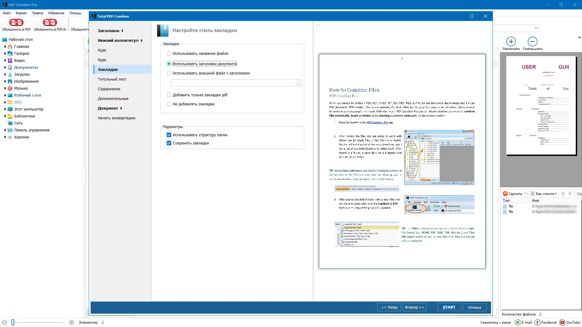 - Автоматическое создание оглавления с использованием закладок на основе имён файлов или заданных шаблонов