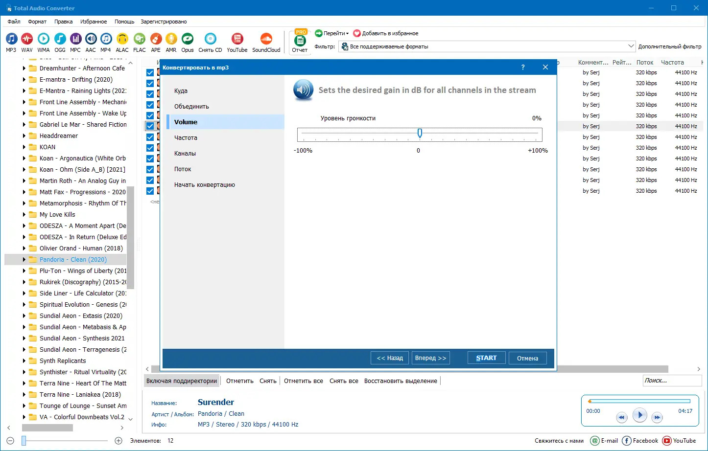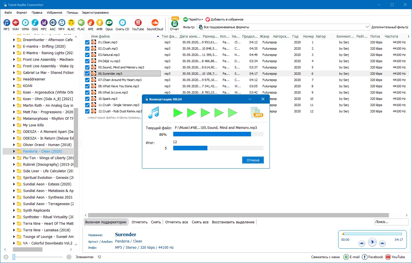 Конвертер аудиоформатов CoolUtils Total Audio Converter предназначен для быстрой и качественной трансформации звуковых файлов без потери качества. Он поддерживает широкий спектр форматов, включая как популярные, так и редкие типы аудиоданных, и позволяет обрабатывать целые папки за один запуск. Благодаря встроенной поддержке ID3-тегов и CUE-файлов, пользователь может сохранять метаданные и структуру альбомов при конвертации. Интеграция в контекстное меню Windows делает работу с программой ещё более удобной. Инструмент подходит как для домашнего использования, так и для профессиональной обработки фонотек.