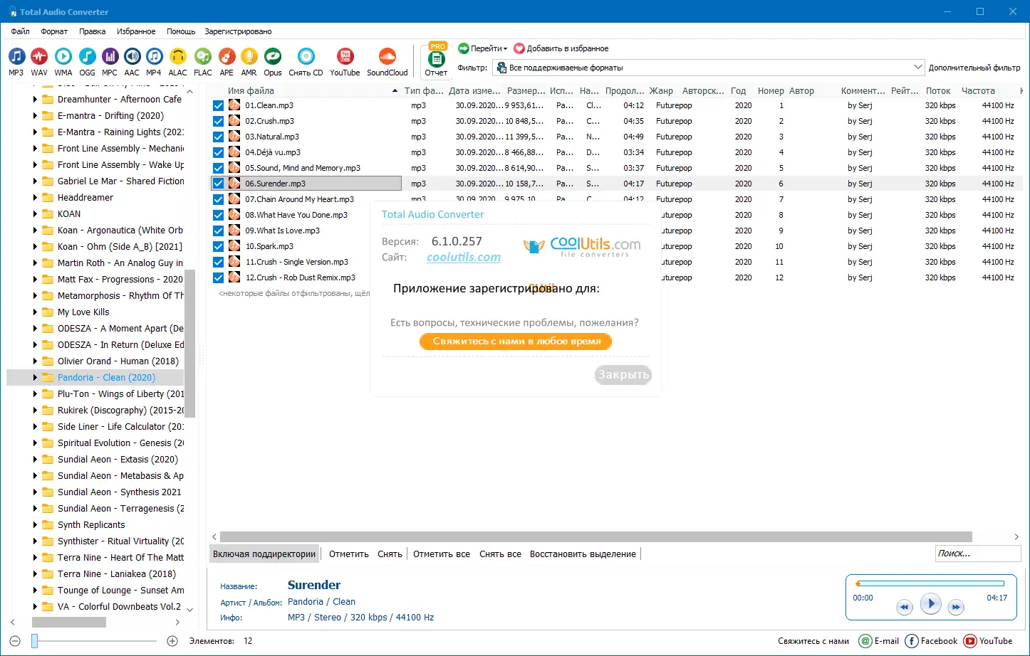 CoolUtils Total Audio Converter — универсальный инструмент для преобразования аудиофайлов между различными форматами с поддержкой пакетной обработки, CD-риппинга и встроенного проигрывателя. Программа отличается высокой скоростью конвертации, отсутствием необходимости в создании временных файлов и интуитивным интерфейсом на русском языке.