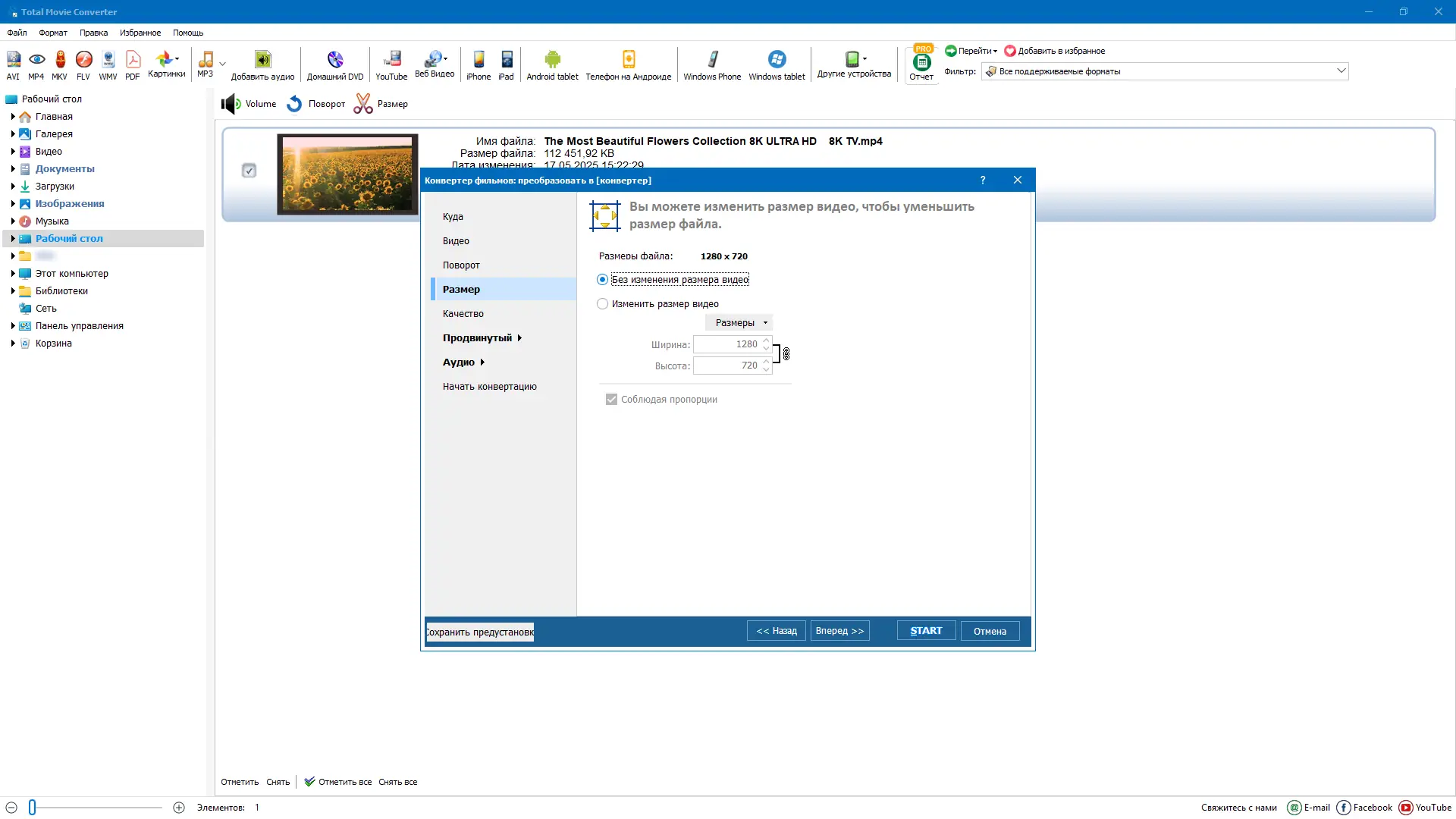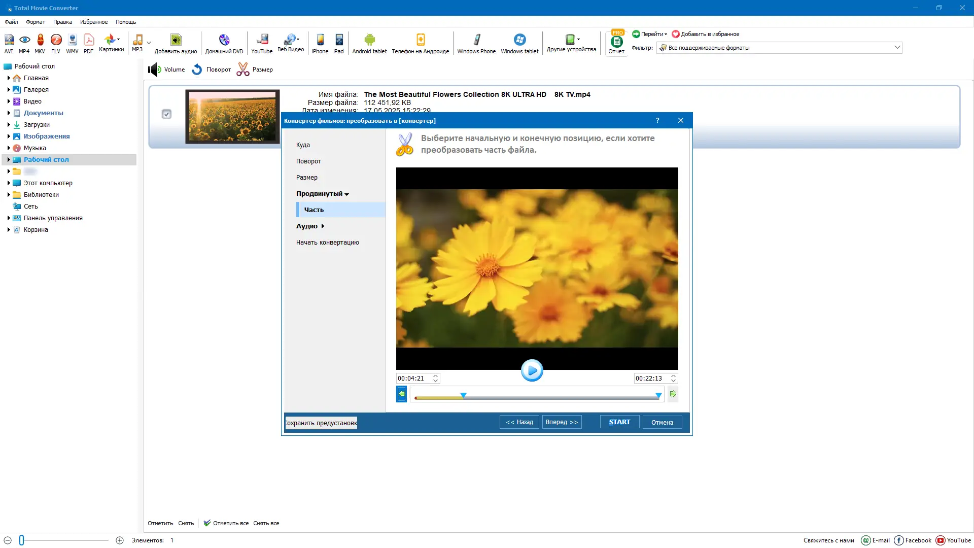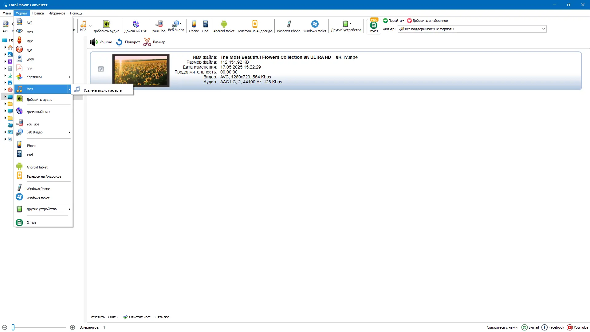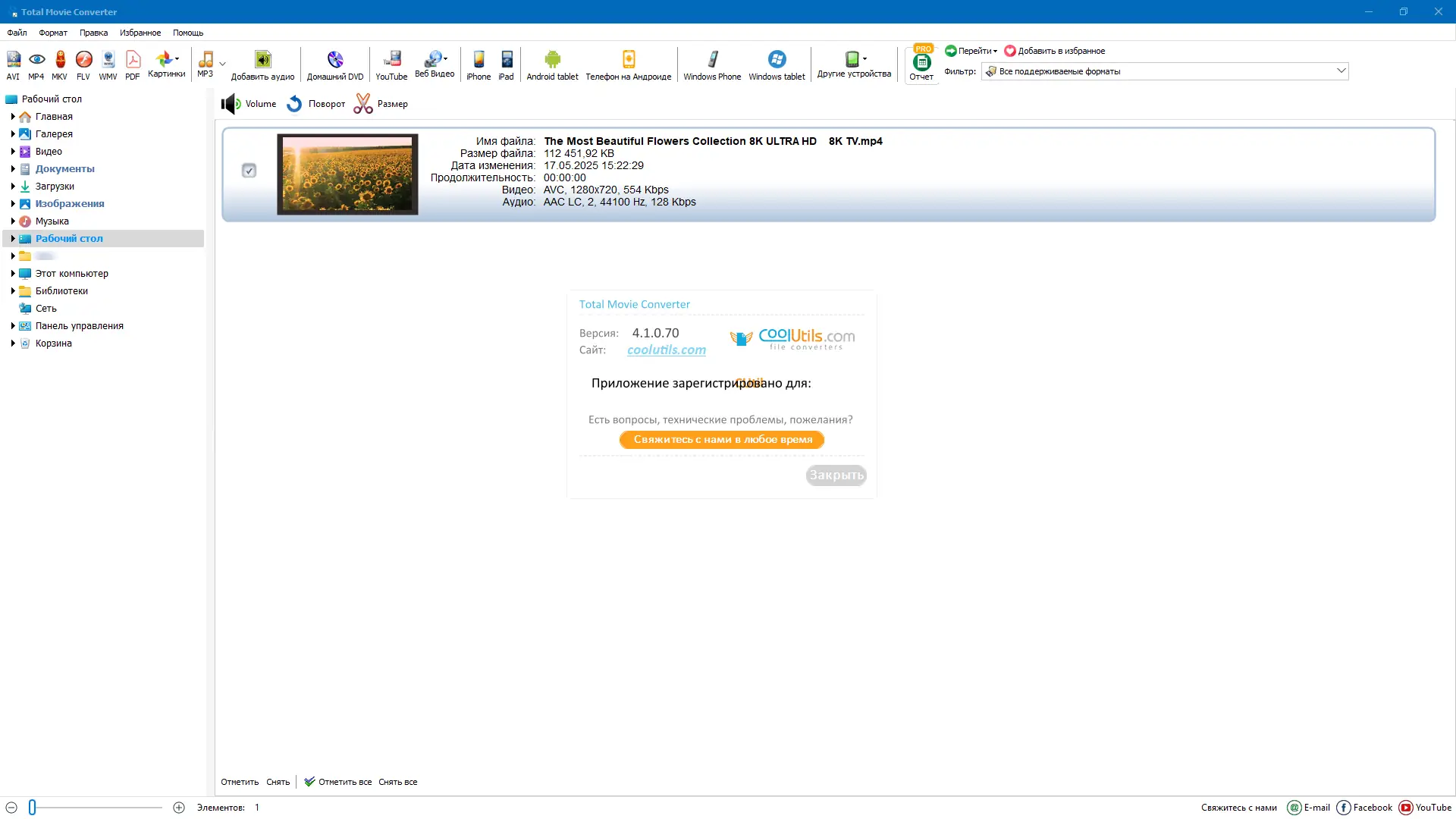 Программа CoolUtils Total Movie Converter позволяет быстро и качественно конвертировать видеофайлы в популярные форматы, такие как AVI, MP4, WMV, FLV и другие. Она поддерживает широкий диапазон исходных видео, включая файлы с цифровых камер, видеорегистраторов, смартфонов и онлайн-платформ. Встроенные настройки оптимизации позволяют подготавливать контент для воспроизведения на устройствах Apple, Sony, Microsoft и других производителей.