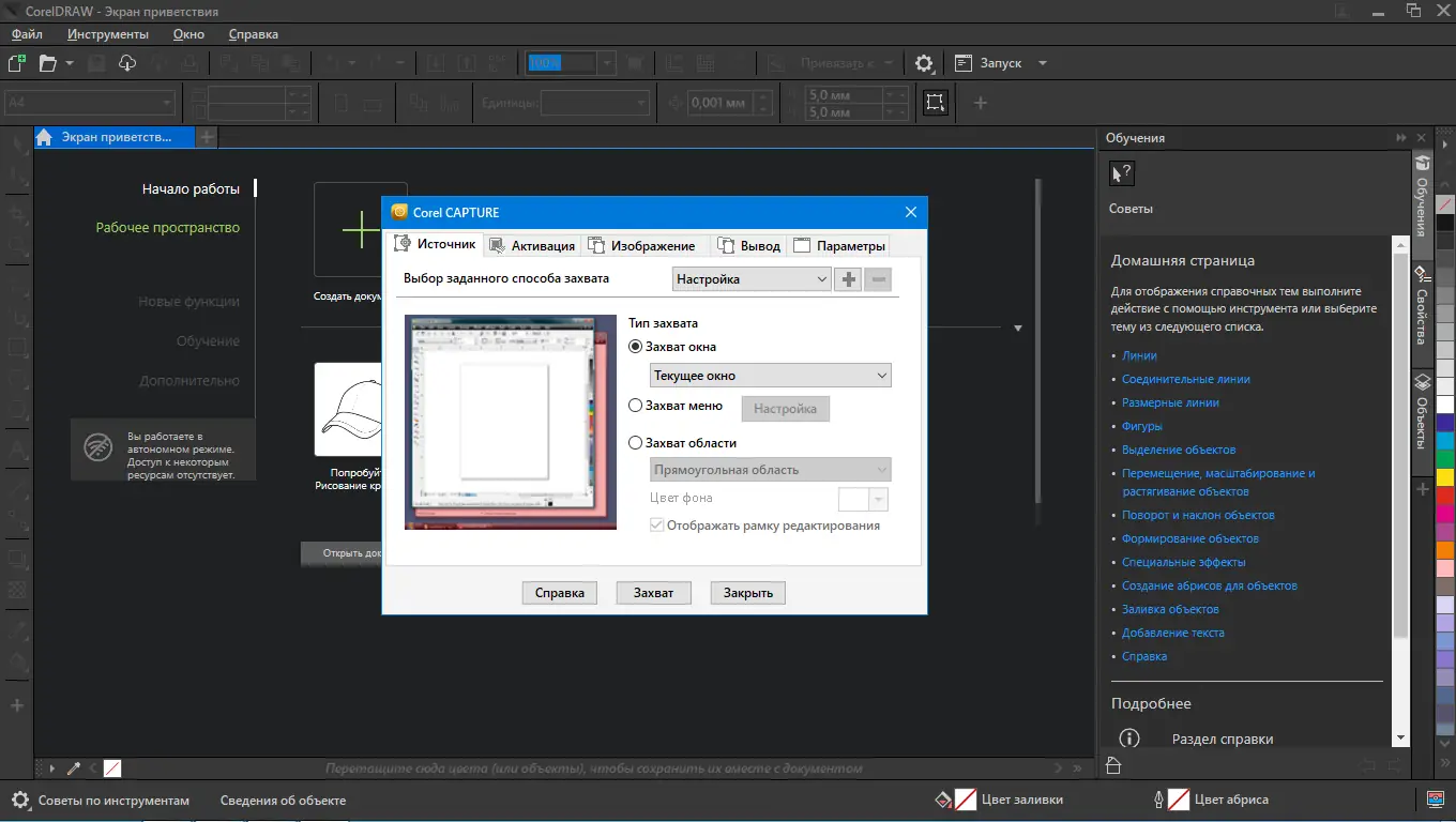 После установки приложение запускается с выбором одного из предустановленных рабочих пространств: «Макет страницы», «Иллюстрация» или совместимого с Adobe. Пользователь может настроить панели инструментов, палитры и свойства под индивидуальные нужды через систему быстрой настройки. Работа с векторными объектами начинается с выбора инструмента рисования, после чего применяются заливки, контуры и эффекты. Для редактирования изображений используется Corel PHOTO-PAINT с возможностью применения спецэффектов, коррекции цвета и работы с RAW-файлами. Экспорт в веб-форматы осуществляется через пиксельный режим и оптимизированные настройки экспорта.