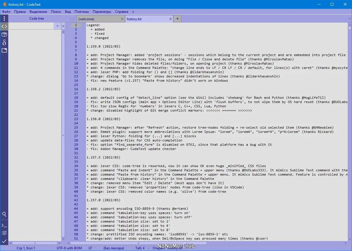 CudaText — это бесплатный мультиплатформенный редактор кода с поддержкой синтаксиса для более чем 150 языков программирования. Программа предлагает удобные инструменты для разработчиков: подсветку, автозавершение, работу с вкладками, настройку горячих клавиш и расширение функционала через плагины, включая поддержку c lsp и интеграцию с lsp client.