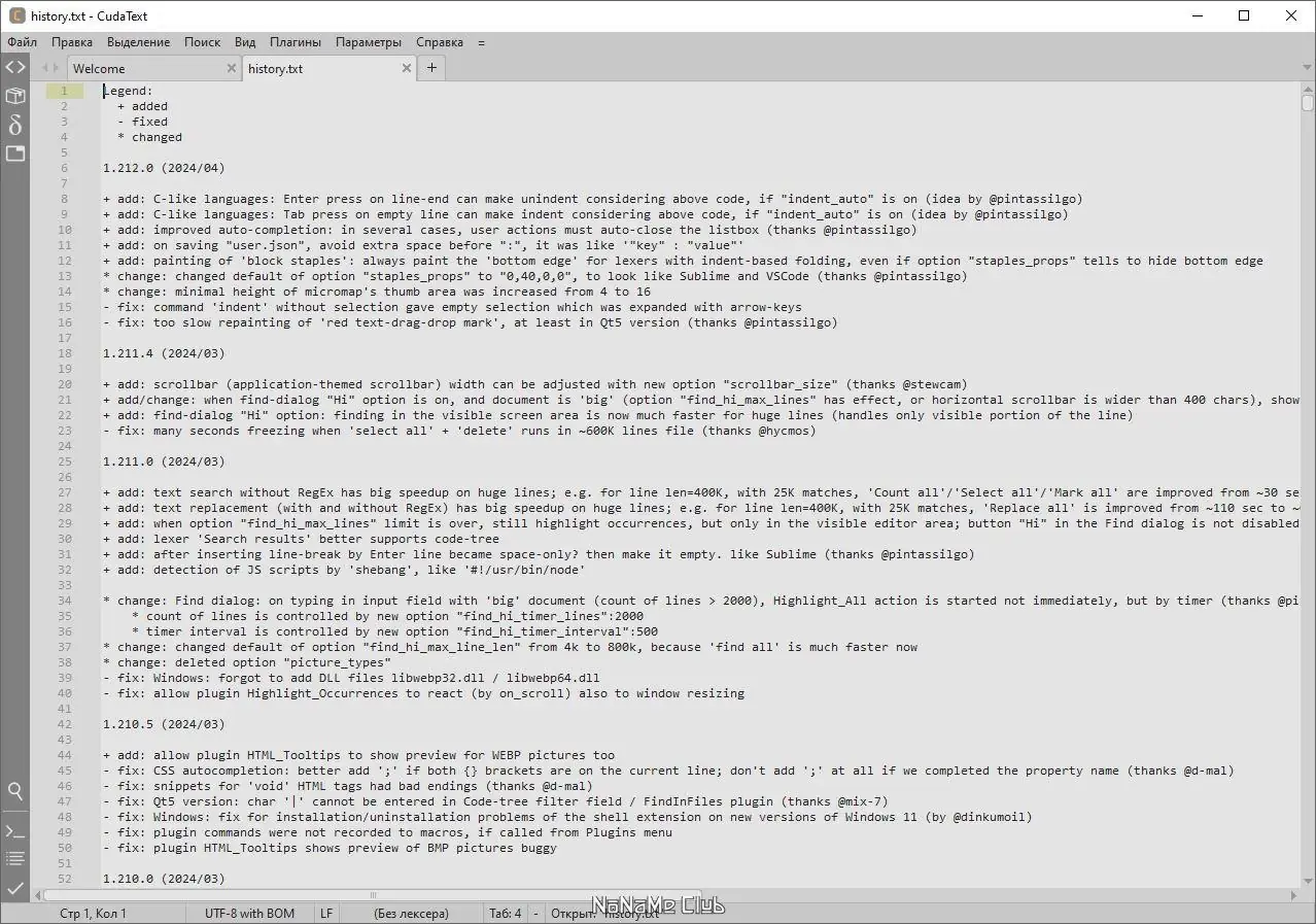 CudaText — это бесплатный мультиплатформенный редактор кода с поддержкой синтаксиса для более чем 150 языков программирования. Программа предлагает гибкую настройку интерфейса, работу с вкладками и группами файлов, а также расширение функционала через плагины, включая поддержку c lsp и lsp client для улучшенного анализа кода.
