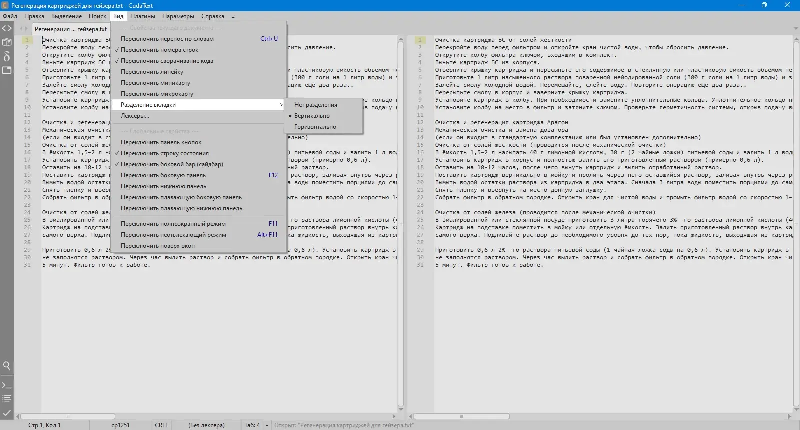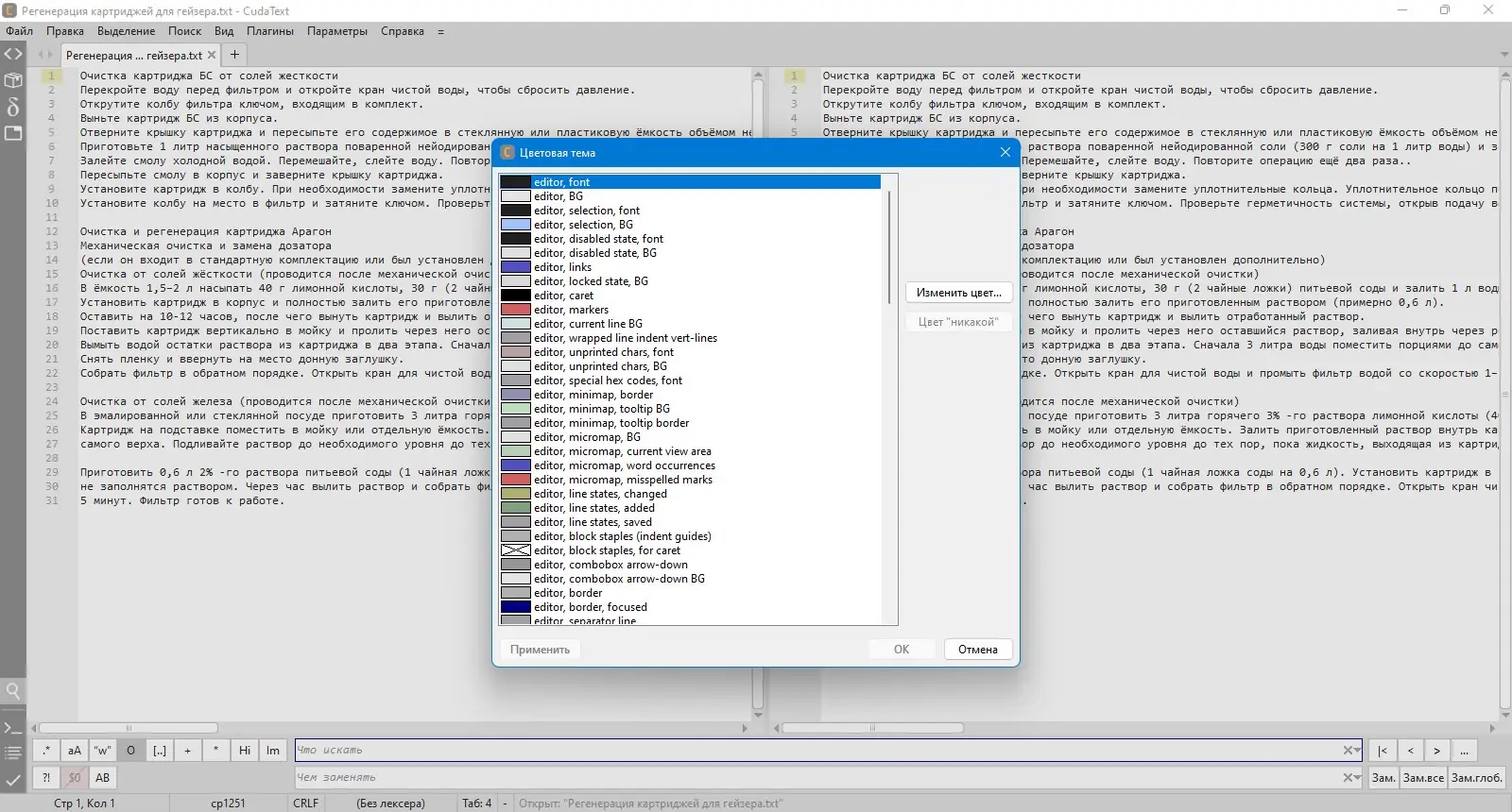 CudaText — это бесплатный мультиплатформенный редактор с поддержкой синтаксиса для более чем ста пятидесяти языков программирования. Программа предлагает гибкую настройку интерфейса, работу с вкладками, группами файлов и расширение функционала через плагины, включая поддержку lsp client для улучшения автодополнения и анализа кода.