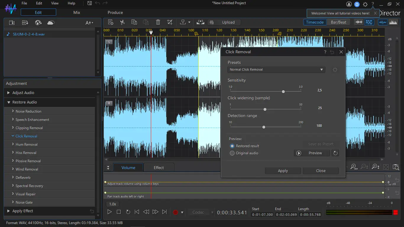 - Инструменты восстановления аудио устраняют клики, шипение, помехи и искажения, характерные для записи на открытом воздухе или с устаревших носителей.