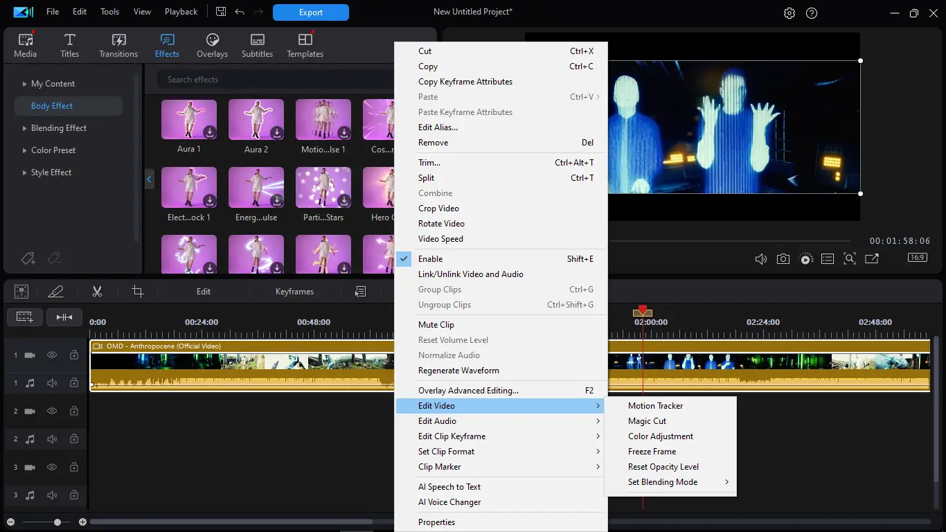 - Расширенные функции монтажа: эффекты переходов, титры, картинка в картинке, частицы