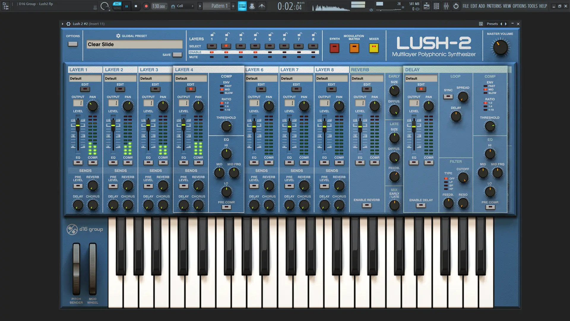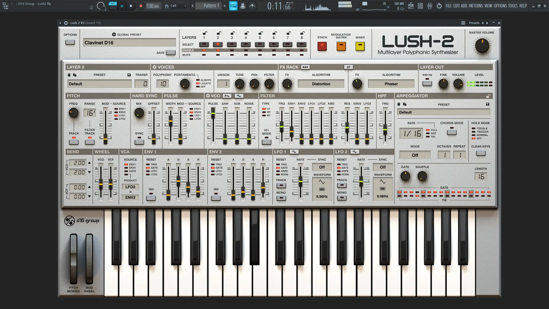 D16 Group — Lush представляет собой виртуальный аналоговый синтезатор, созданный с уклоном в ретро-эстетику и современную функциональность. Он вдохновлён классическими синтезаторами, но значительно превосходит их по возможностям за счёт цифровой природы. Архитектура приложения позволяет использовать до восьми независимых слоёв, каждый из которых может работать как отдельный синтезатор или объединяться в единую тембральную структуру. Интерфейс сохраняет визуальную стилистику аналоговых устройств, включая опциональные цветовые схемы, напоминающие SH-101. Программа поддерживает мультитембральное воспроизведение, что делает её подходящей для сложных аранжировок и живых выступлений.