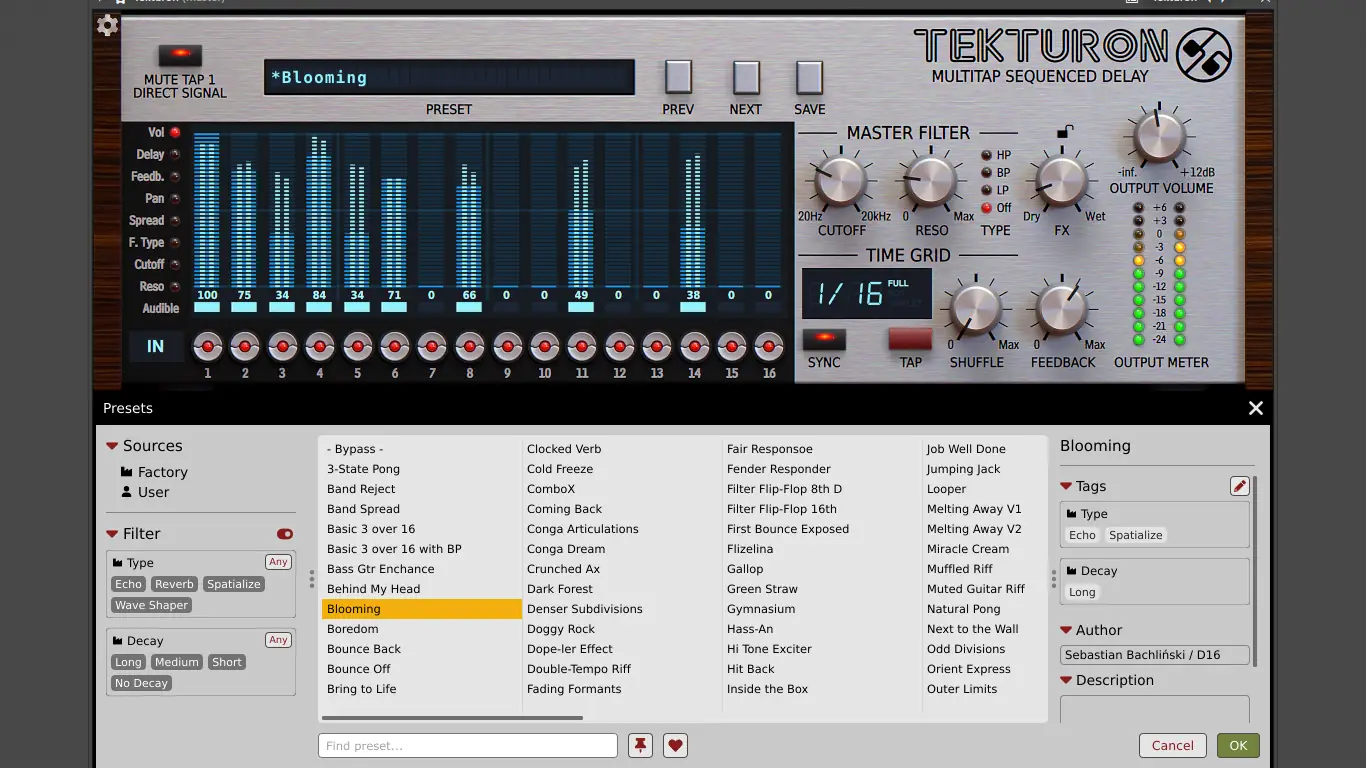 - Tekturon — multi-tap дилей с секвенсором и матричной топологией, позволяющий строить сложные ритмические структуры в задержках.